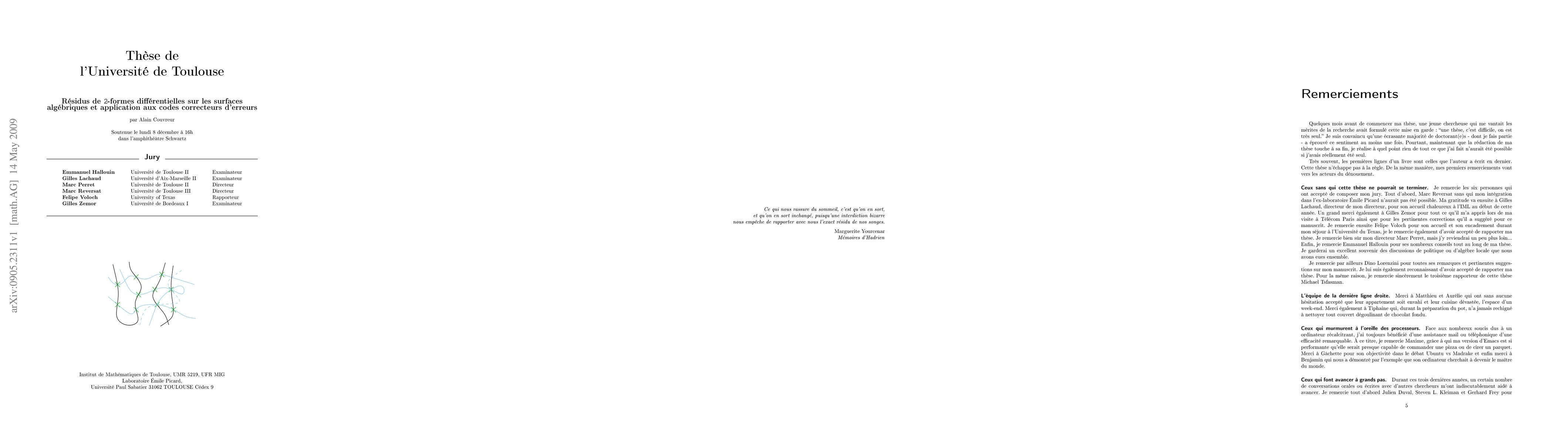 The theory of algebraic-geometric codes has been developed in the beginning of the 80's after a paper of V.D. Goppa. Given a smooth projective algebraic curve X over a finite field, there are two different constructions of error-correcting codes. The first one, called "functional", uses some rational functions on X and the second one, called "differential", involves some rational 1-forms on this curve. Hundreds of papers are devoted to the study of such codes. In addition, a generalization of the functional construction for algebraic varieties of arbitrary dimension is given by Y. Manin in an article of 1984. A few papers about such codes has been published, but nothing has been done concerning a generalization of the differential construction to the higher-dimensional case. In this thesis, we propose a differential construction of codes on algebraic surfaces. Afterwards, we study the properties of these codes and particularly their relations with functional codes. A pretty surprising fact is that a main difference with the case of curves appears. Indeed, if in the case of curves, a differential code is always the orthogonal of a functional one, this assertion generally fails for surfaces. Last observation motivates the study of codes which are the orthogonal of some functional code on a surface. Therefore, we prove that, under some condition on the surface, these codes can be realized as sums of differential codes. Moreover, we show that some answers to some open problems "a la Bertini" could give very interesting informations on the parameters of these codes.