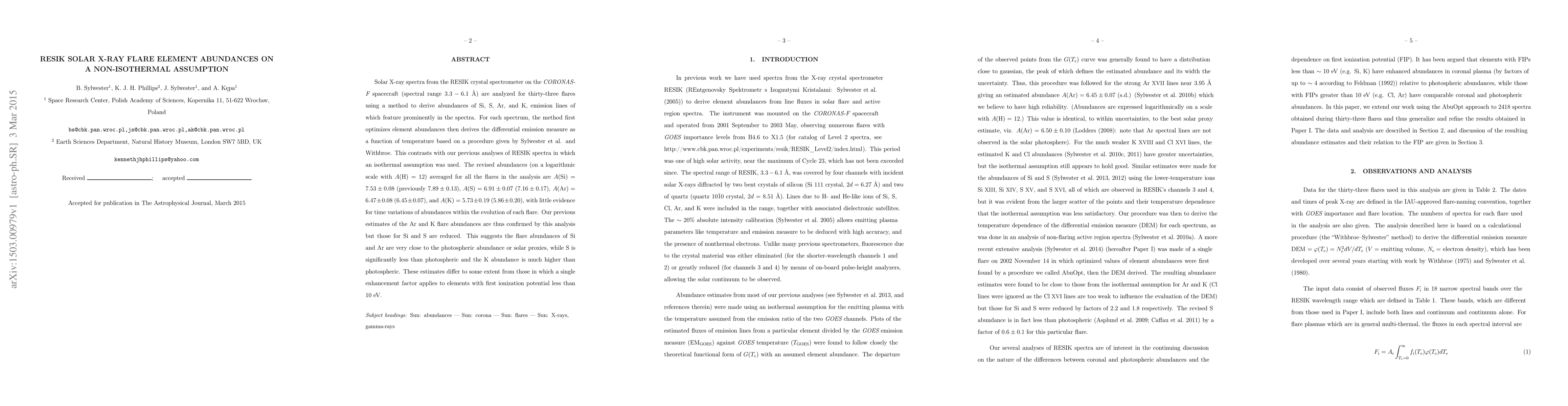 This paper analyzes solar X-ray flares using RESIK spectrometer data, deriving non-isothermal element abundances for Si, S, Ar, and K. The revised abundances show reduced values for Si and S compared to previous isothermal assumptions, suggesting Si and Ar are close to photospheric levels while S is significantly lower and K much higher.