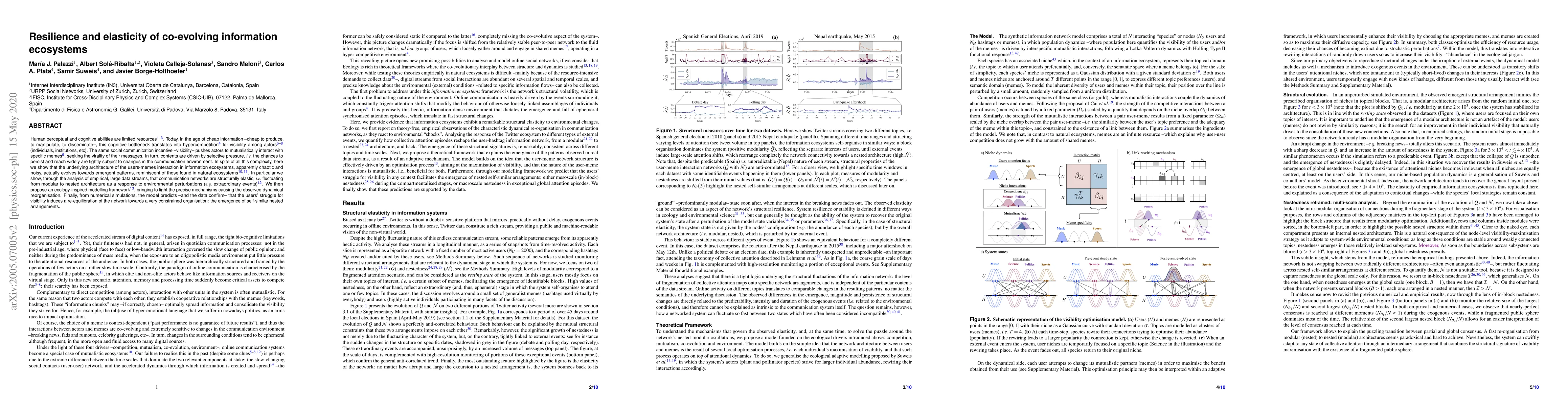 Human perceptual and cognitive abilities are limited resources. Today, in the age of cheap information --cheap to produce, to manipulate, to disseminate--, this cognitive bottleneck translates into hypercompetition for visibility among actors (individuals, institutions, etc). The same social communication incentive --visibility-- pushes actors to mutualistically interact with specific memes, seeking the virality of their messages. In turn, contents are driven by selective pressure, i.e. the chances to persist and reach widely are tightly subject to changes in the communication environment. In spite of all this complexity, here we show that the underlying architecture of the users-memes interaction in information ecosystems, apparently chaotic and noisy, actually evolves towards emergent patterns, reminiscent of those found in natural ecosystems. In particular we show, through the analysis of empirical, large data streams, that communication networks are structurally elastic, i.e. fluctuating from modular to nested architecture as a response to environmental perturbations (e.g. extraordinary events). We then propose an ecology-inspired modelling framework, bringing to light the precise mechanisms causing the observed dynamical reorganisation. Finally, from numerical simulations, the model predicts --and the data confirm-- that the users' struggle for visibility induces a re-equilibration of the network towards a very constrained organisation: the emergence of self-similar nested arrangements.