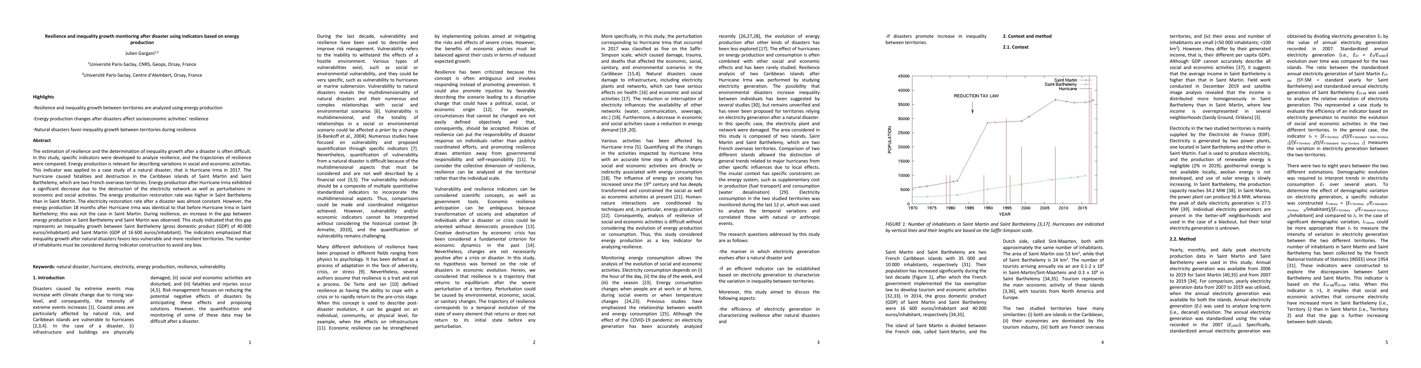 This study developed specific indicators based on energy production to assess resilience and inequality growth after Hurricane Irma in 2017 in Saint Martin and Saint Barthelemy. The results showed higher resilience and energy production restoration in Saint Barthelemy, highlighting growing inequality between the two regions post-disaster.