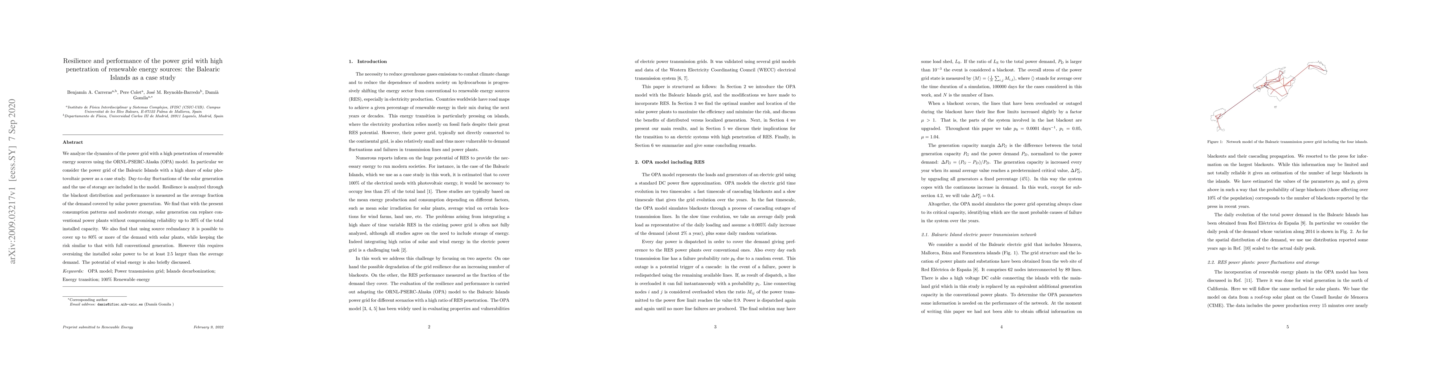 We analyze the dynamics of the power grid with a high penetration of renewable energy sources using the ORNL-PSERC-Alaska (OPA) model. In particular we consider the power grid of the Balearic Islands with a high share of solar photovoltaic power as a case study. Day-to-day fluctuations of the solar generation and the use of storage are included in the model. Resilience is analyzed through the blackout distribution and performance is measured as the average fraction of the demand covered by solar power generation. We find that with the present consumption patterns and moderate storage, solar generation can replace conventional power plants without compromising reliability up to $30\%$ of the total installed capacity. We also find that using source redundancy it is possible to cover up to $80\%$ or more of the demand with solar plants, while keeping the risk similar to that with full conventional generation. However this requires oversizing the installed solar power to be at least $2.5$ larger than the average demand. The potential of wind energy is also briefly discussed