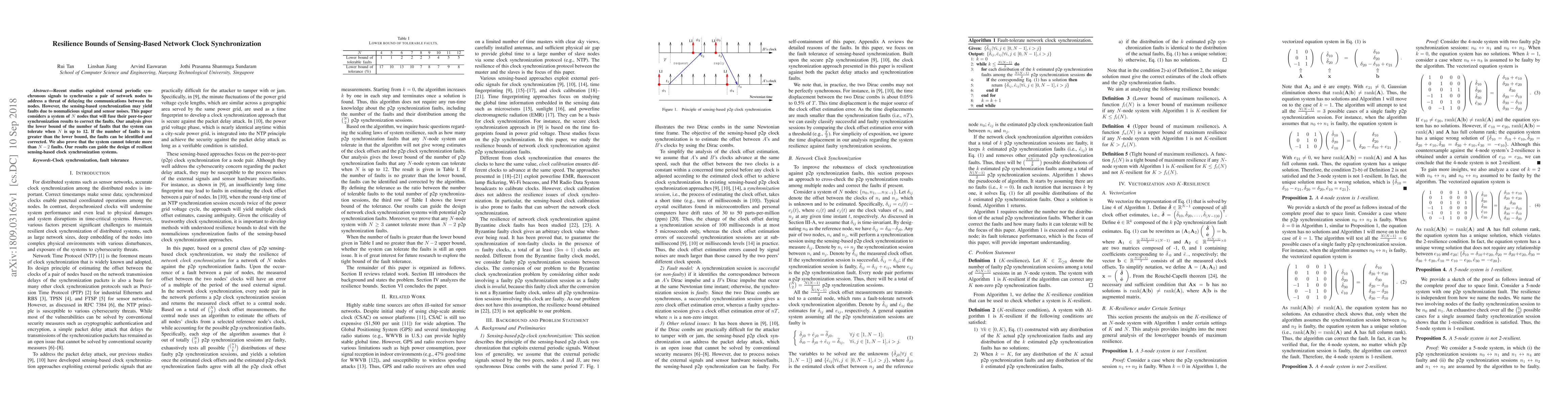 Recent studies exploited external periodic synchronous signals to synchronize a pair of network nodes to address a threat of delaying the communications between the nodes. However, the sensing-based synchronization may yield faults due to nonmalicious signal and sensor noises. This paper considers a system of N nodes that will fuse their peer-to-peer synchronization results to correct the faults. Our analysis gives the lower bound of the number of faults that the system can tolerate when N is up to 12. If the number of faults is no greater than the lower bound, the faults can be identified and corrected. We also prove that the system cannot tolerate more than N-2 faults. Our results can guide the design of resilient sensing-based clock synchronization systems.