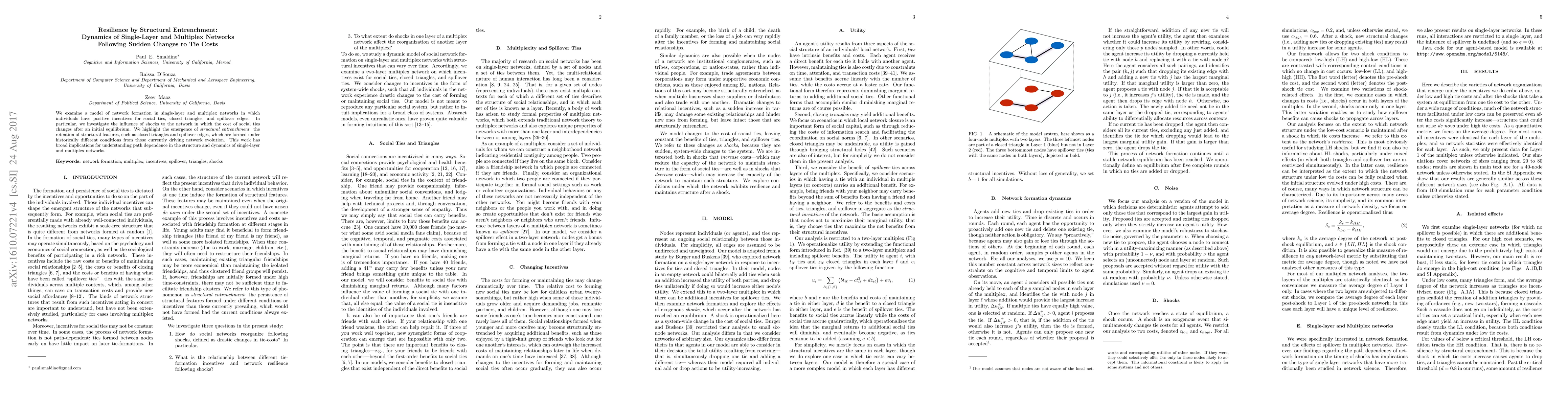 The paper introduces a model for understanding resilience through structural entrenchment in single-layer and multiplex networks, highlighting the role of spillover effects and path dependence in network evolution following shocks to tie costs.