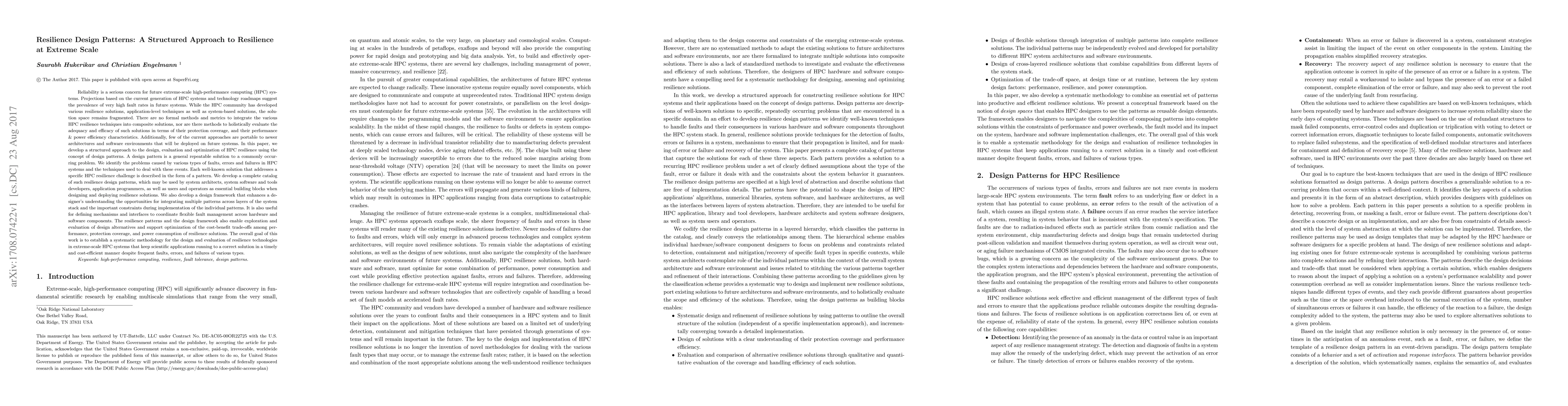 This paper proposes a structured approach to designing and evaluating resilience in extreme-scale high-performance computing (HPC) systems using design patterns. It catalogs resilience design patterns to address various fault, error, and failure scenarios, providing a framework for integrating multiple patterns and coordinating fault management across hardware and software layers.