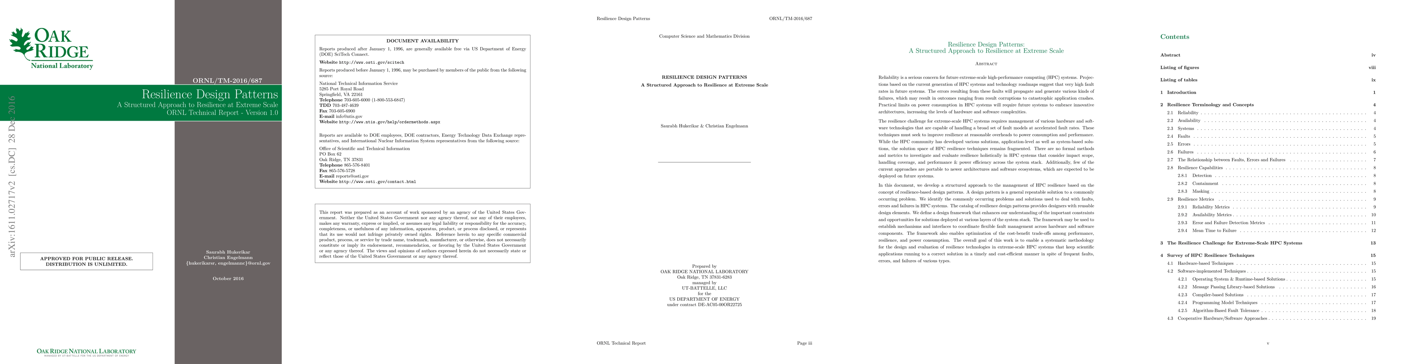 In this document, we develop a structured approach to the management of HPC resilience based on the concept of resilience-based design patterns. A design pattern is a general repeatable solution to a commonly occurring problem. We identify the commonly occurring problems and solutions used to deal with faults, errors and failures in HPC systems. The catalog of resilience design patterns provides designers with reusable design elements. We define a design framework that enhances our understanding of the important constraints and opportunities for solutions deployed at various layers of the system stack. The framework may be used to establish mechanisms and interfaces to coordinate flexible fault management across hardware and software components. The framework also enables optimization of the cost-benefit trade-offs among performance, resilience, and power consumption. The overall goal of this work is to enable a systematic methodology for the design and evaluation of resilience technologies in extreme-scale HPC systems that keep scientific applications running to a correct solution in a timely and cost-efficient manner in spite of frequent faults, errors, and failures of various types.
