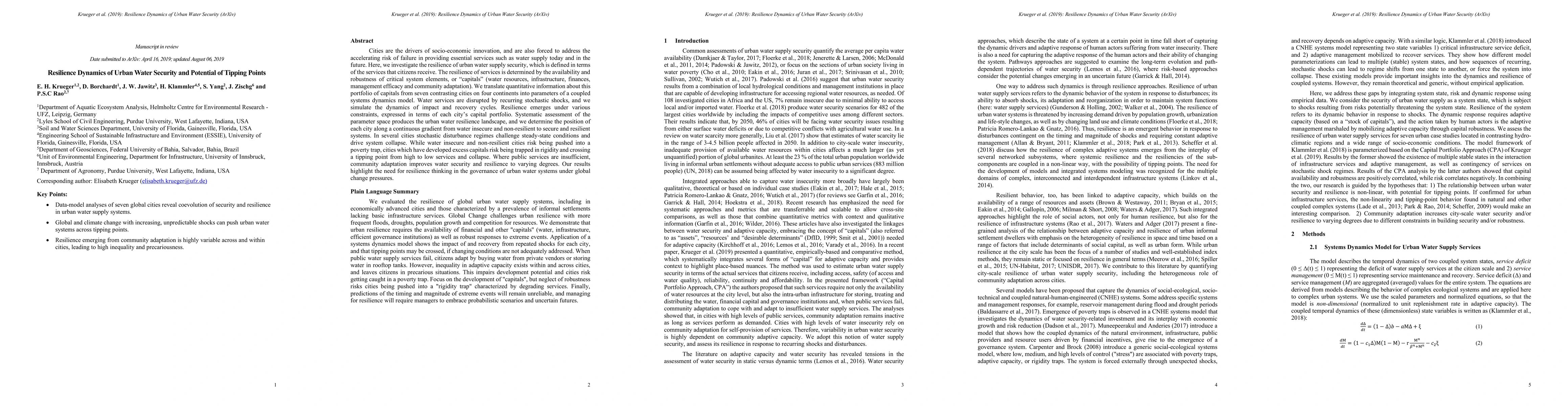 This paper investigates urban water supply security resilience across seven cities, identifying critical system elements or 'capitals' that determine resilience. It models the impact of stochastic shocks on water services and finds that cities with insufficient capitals risk collapse, while those with excess capitals may face rigidity and tipping points leading to service decline. The study emphasizes the importance of resilience strategies in urban water governance amidst global change.