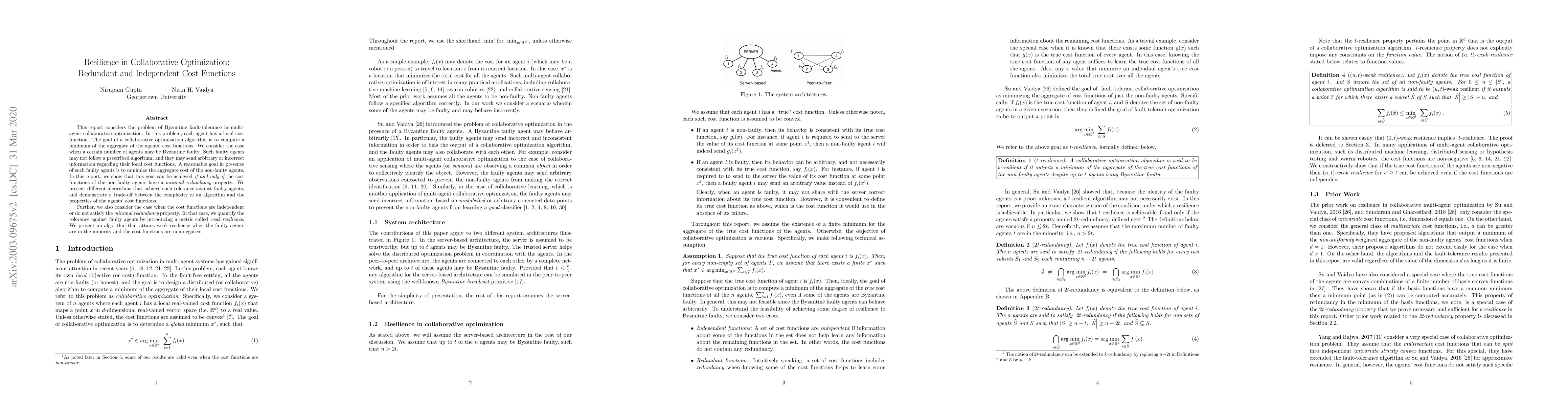 Researchers found that minimizing aggregate cost in collaborative optimization requires non-faulty agents to have a minimal redundancy property. They also developed algorithms for tolerating faulty agents under different conditions.