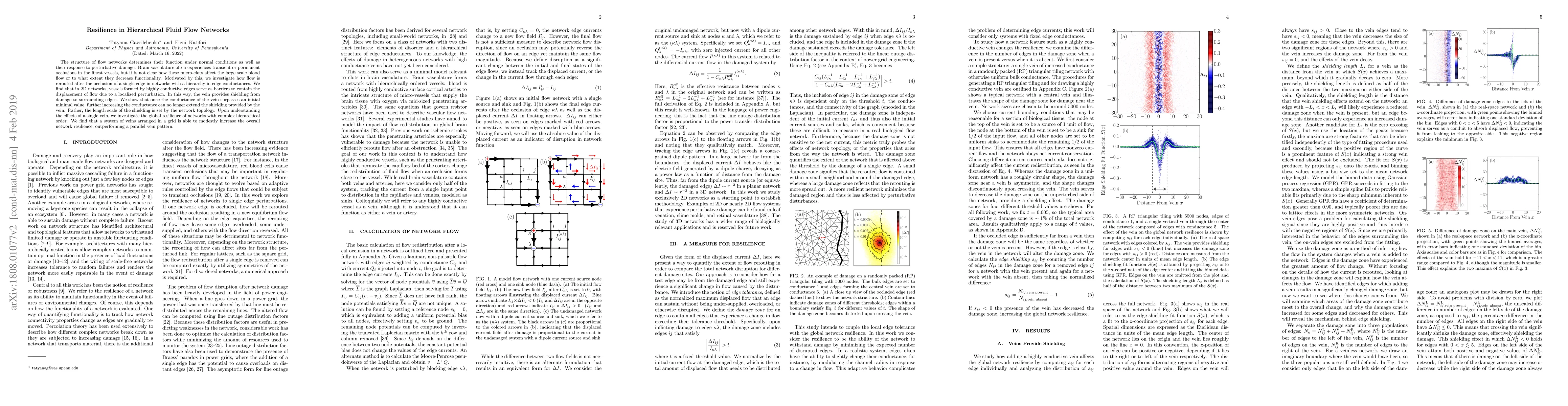 This paper examines how hierarchical fluid flow networks respond to localized damage, focusing on the role of highly conductive veins in containing flow displacement. It finds that veins with sufficient conductivity provide shielding to surrounding edges, but beyond a minimal conductivity level, the shielding is determined by network topology rather than vein conductivity. The study concludes that a grid arrangement of veins enhances overall network resilience more effectively than a parallel vein pattern.