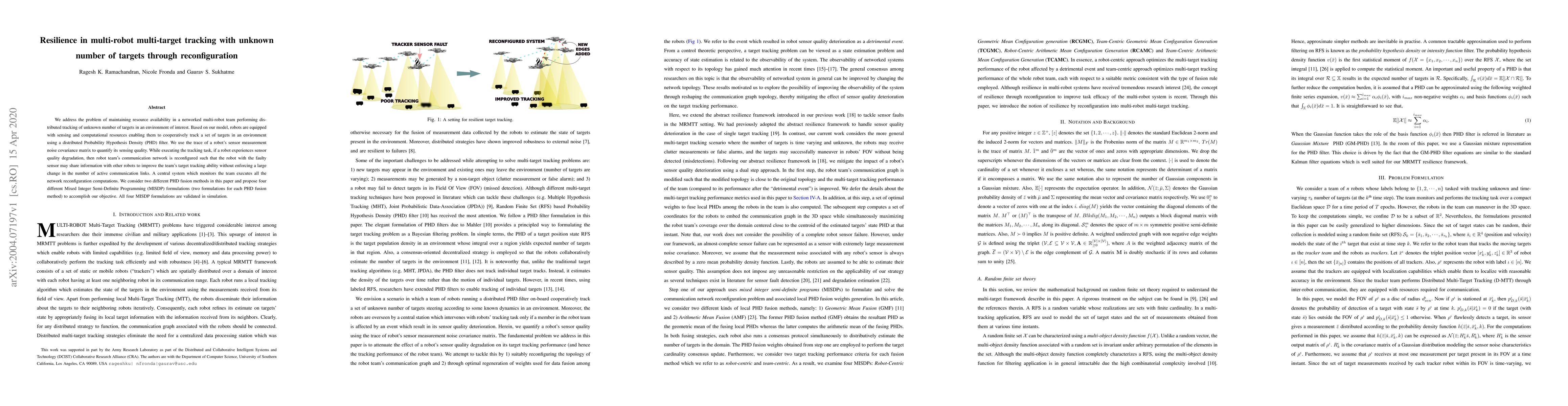 The paper presents a methodology involving a base station that monitors a multi-robot team for distributed tracking of unknown targets using a PHD filter. The approach reconfigures the communication network when a robot's sensor quality degrades, optimizing tracking performance through Mixed Integer Semi-Definite Programming (MISDP) formulations.