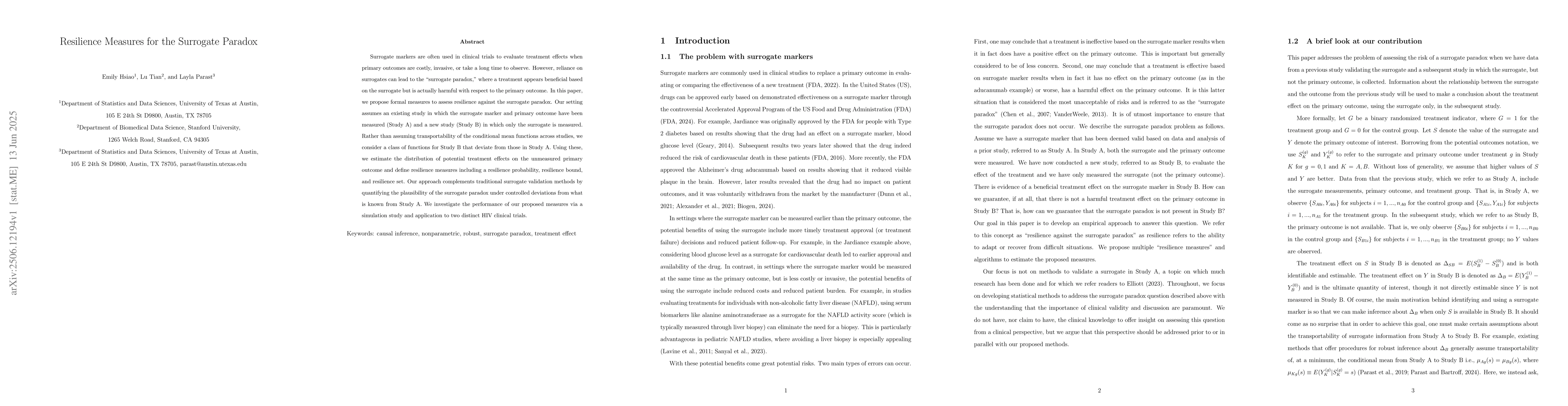 The work stands out by introducing resilience measures that quantify the plausibility of the surrogate paradox under controlled deviations from known Study A data, complementing traditional surrogate validation methods.