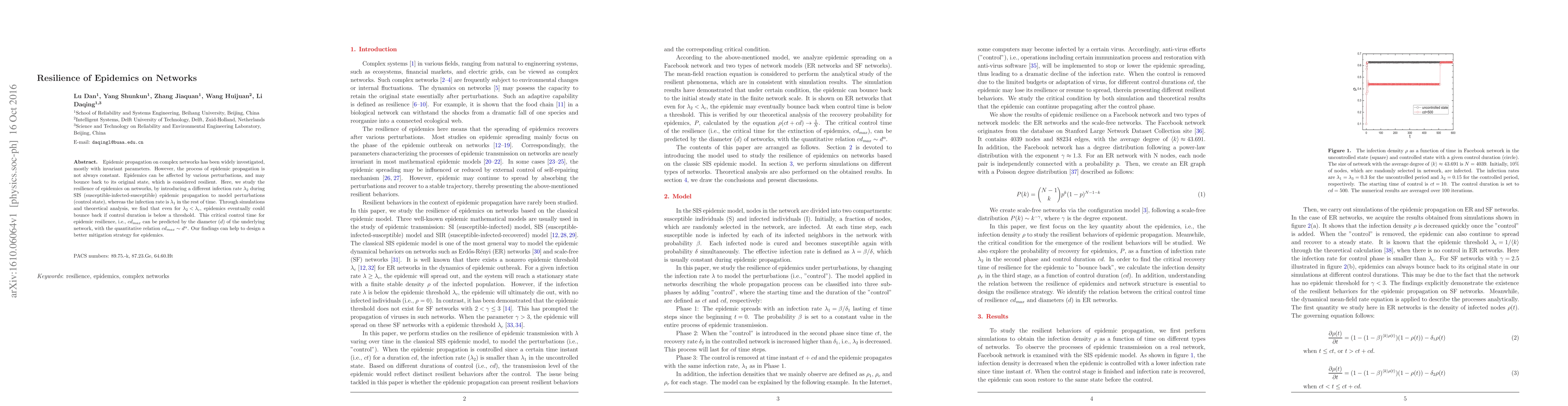 Epidemic propagation on complex networks has been widely investigated, mostly with invariant parameters. However, the process of epidemic propagation is not always constant. Epidemics can be affected by various perturbations, and may bounce back to its original state, which is considered resilient. Here, we study the resilience of epidemics on networks, by introducing a different infection rate ${\lambda_{2}}$ during SIS (susceptible-infected-susceptible) epidemic propagation to model perturbations (control state), whereas the infection rate is ${\lambda_{1}}$ in the rest of time. Through simulations and theoretical analysis, we find that even for ${\lambda_{2}<\lambda_{c}}$, epidemics eventually could bounce back if control duration is below a threshold. This critical control time for epidemic resilience, i.e., ${cd_{max}}$ can be predicted by the diameter (${d}$) of the underlying network, with the quantitative relation ${cd_{max}\sim d^{\alpha}}$. Our findings can help to design a better mitigation strategy for epidemics.