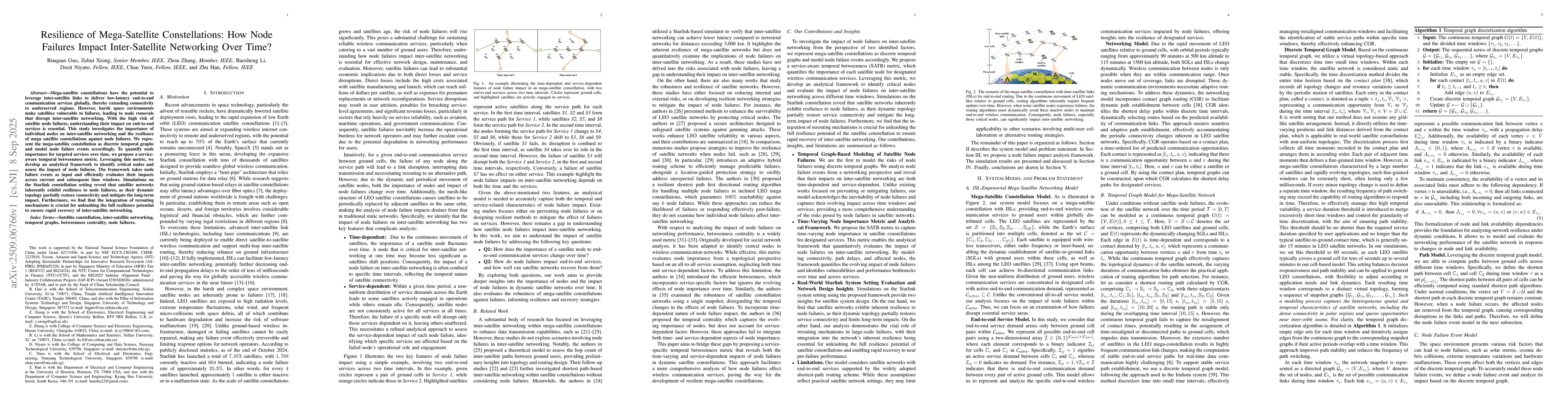 Mega-satellite constellations have the potential to leverage inter-satellite links to deliver low-latency end-to-end communication services globally, thereby extending connectivity to underserved regions. However, harsh space environments make satellites vulnerable to failures, leading to node removals that disrupt inter-satellite networking. With the high risk of satellite node failures, understanding their impact on end-to-end services is essential. This study investigates the importance of individual nodes on inter-satellite networking and the resilience of mega satellite constellations against node failures. We represent the mega-satellite constellation as discrete temporal graphs and model node failure events accordingly. To quantify node importance for targeted services over time, we propose a service-aware temporal betweenness metric. Leveraging this metric, we develop an analytical framework to identify critical nodes and assess the impact of node failures. The framework takes node failure events as input and efficiently evaluates their impacts across current and subsequent time windows. Simulations on the Starlink constellation setting reveal that satellite networks inherently exhibit resilience to node failures, as their dynamic topology partially restore connectivity and mitigate the long-term impact. Furthermore, we find that the integration of rerouting mechanisms is crucial for unleashing the full resilience potential to ensure rapid recovery of inter-satellite networking.