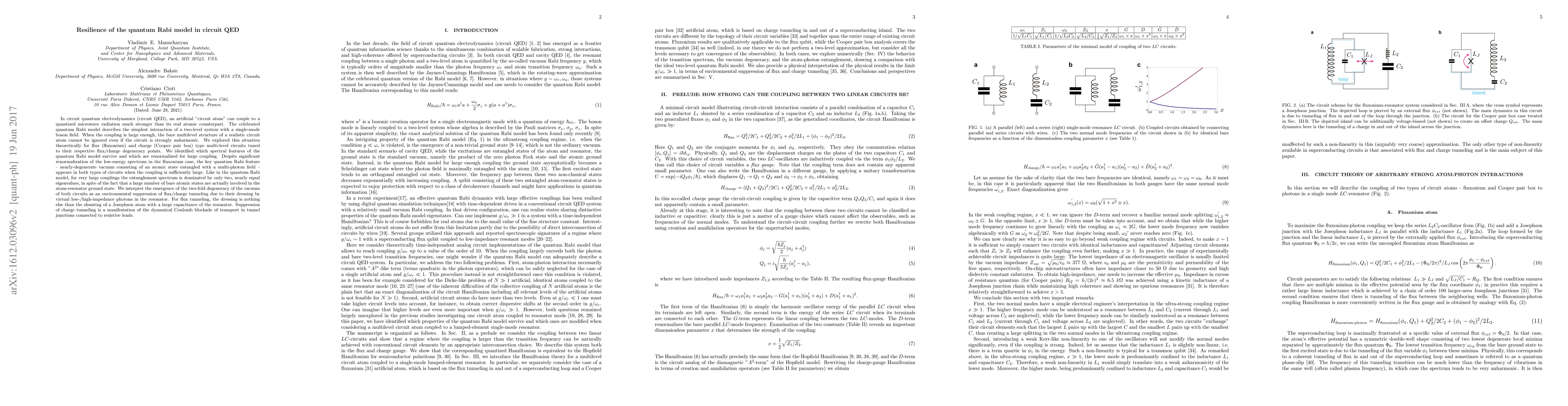 In circuit quantum electrodynamics (circuit QED), an artificial "circuit atom" can couple to a quantized microwave radiation much stronger than its real atomic counterpart. The celebrated quantum Rabi model describes the simplest interaction of a two-level system with a single-mode boson field. When the coupling is large enough, the bare multilevel structure of a realistic circuit atom cannot be ignored even if the circuit is strongly anharmonic. We explored this situation theoretically for flux (fluxonium) and charge (Cooper pair box) type multi-level circuits tuned to their respective flux/charge degeneracy points. We identified which spectral features of the quantum Rabi model survive and which are renormalized for large coupling. Despite significant renormalization of the low-energy spectrum in the fluxonium case, the key quantum Rabi feature -- nearly-degenerate vacuum consisting of an atomic state entangled with a multi-photon field -- appears in both types of circuits when the coupling is sufficiently large. Like in the quantum Rabi model, for very large couplings the entanglement spectrum is dominated by only two, nearly equal eigenvalues, in spite of the fact that a large number of bare atomic states are actually involved in the atom-resonator ground state. We interpret the emergence of the two-fold degeneracy of the vacuum of both circuits as an environmental suppression of flux/charge tunneling due to their dressing by virtual low-/high-impedance photons in the resonator. For flux tunneling, the dressing is nothing else than the shunting of a Josephson atom with a large capacitance of the resonator. Suppression of charge tunneling is a manifestation of the dynamical Coulomb blockade of transport in tunnel junctions connected to resistive leads.