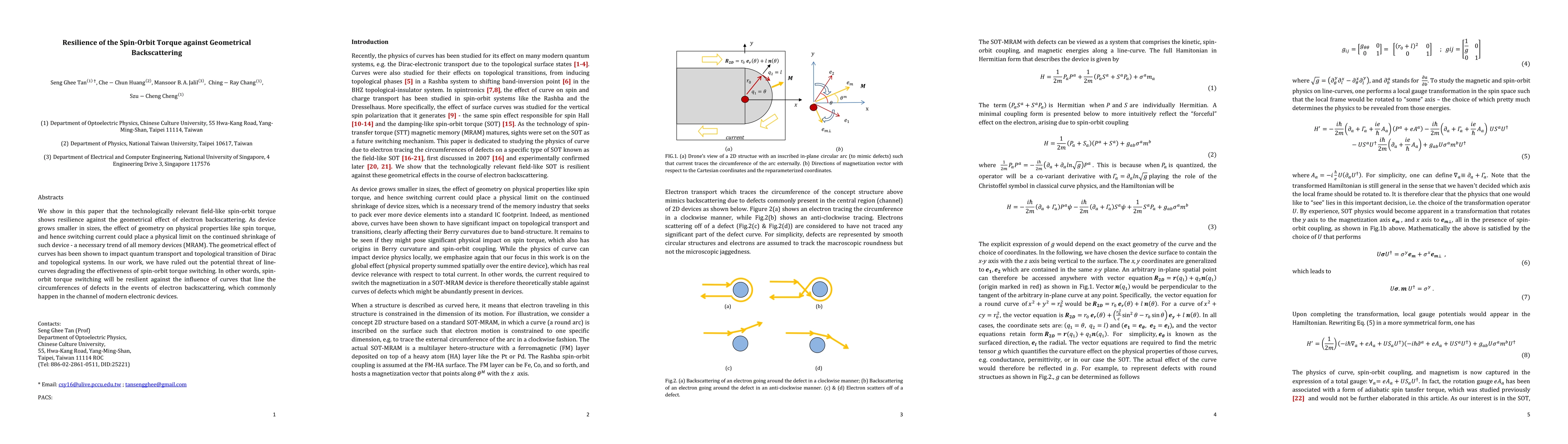 We show in this paper that the technologically relevant field-like spin-orbit torque shows resilience against the geometrical effect of electron backscattering. As device grows smaller in sizes, the effect of geometry on physical properties like spin torque, and hence switching current could place a physical limit on the continued shrinkage of such device -- a necessary trend of all memory devices (MRAM). The geometrical effect of curves has been shown to impact quantum transport and topological transition of Dirac and topological systems. In our work, we have ruled out the potential threat of line-curves degrading the effectiveness of spin-orbit torque switching. In other words, spin-orbit torque switching will be resilient against the influence of curves that line the circumferences of defects in the events of electron backscattering, which commonly happen in the channel of modern electronic devices.