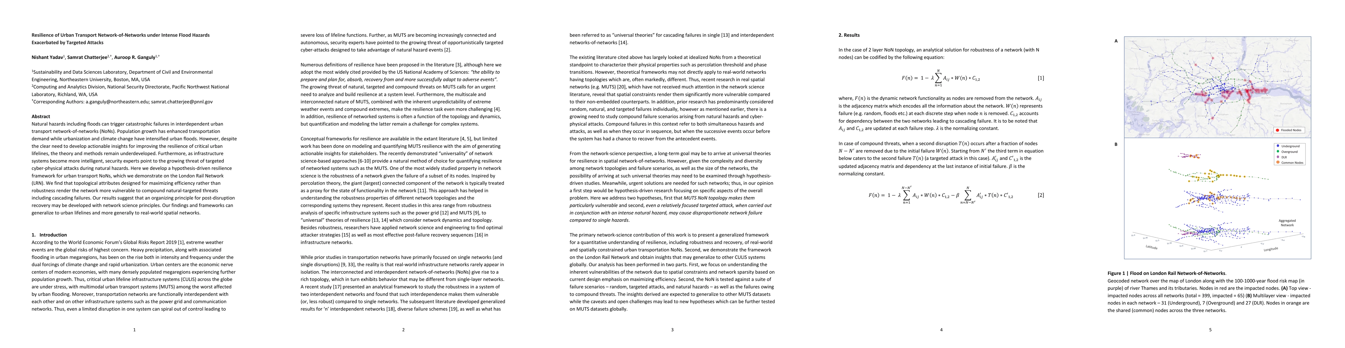 Natural hazards including floods can trigger catastrophic failures in interdependent urban transport network-of-networks (NoNs). Population growth has enhanced transportation demand while urbanization and climate change have intensified urban floods. However, despite the clear need to develop actionable insights for improving the resilience of critical urban lifelines, the theory and methods remain underdeveloped. Furthermore, as infrastructure systems become more intelligent, security experts point to the growing threat of targeted cyber-physical attacks during natural hazards. Here we develop a hypothesis-driven resilience framework for urban transport NoNs, which we demonstrate on the London Rail Network (LRN). We find that topological attributes designed for maximizing efficiency rather than robustness render the network more vulnerable to compound natural-targeted threats including cascading failures. Our results suggest that an organizing principle for post-disruption recovery may be developed with network science principles. Our findings and frameworks can generalize to urban lifelines and more generally to real-world spatial networks.