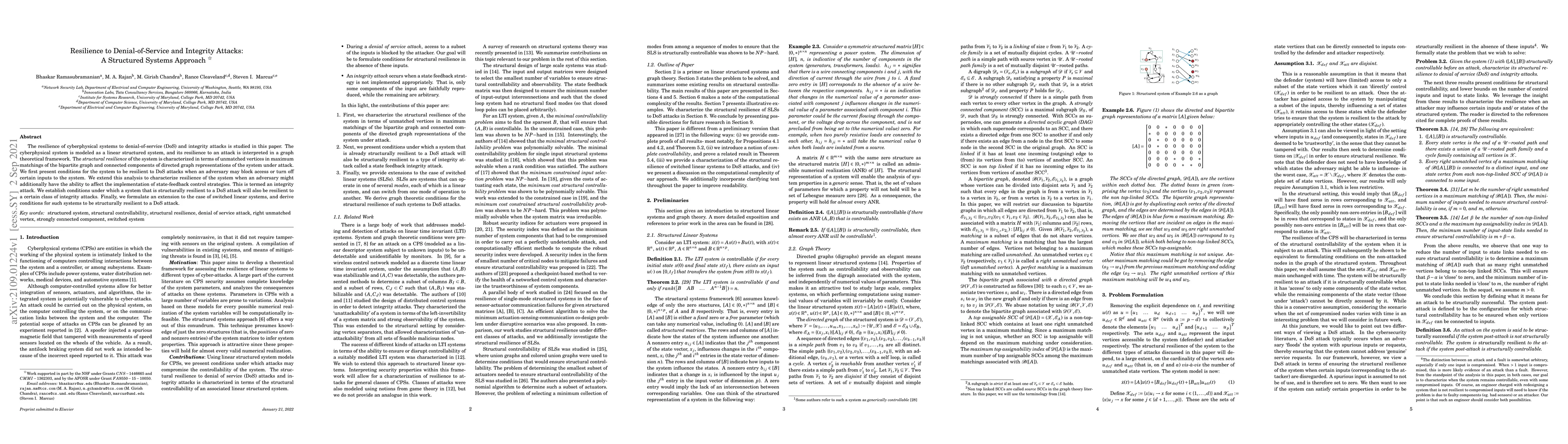 This paper explores the resilience of cyberphysical systems to denial-of-service (DoS) and integrity attacks through a structured systems approach. It characterizes structural resilience using graph theory and establishes conditions for resilience under both attack types, extending analysis to switched linear systems.