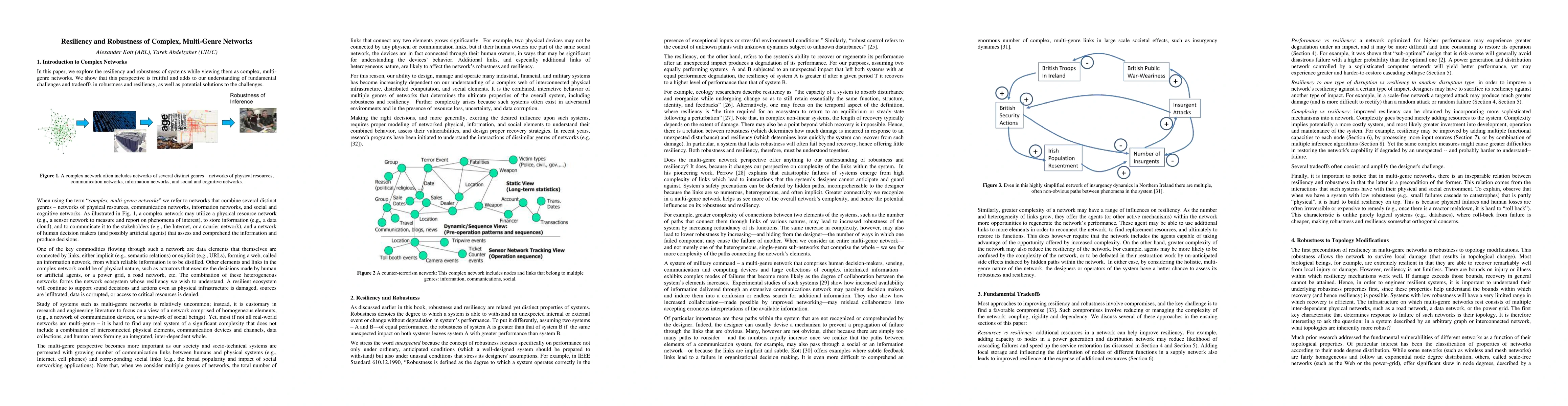 We explore the resiliency and robustness of systems while viewing them as complex, multi-genre networks. The term "complex, multi-genre networks" refers to networks that combine several distinct genres - networks of physical resources, communication networks, information networks, and social and cognitive networks. We show that this perspective is fruitful and adds to our understanding of fundamental challenges and tradeoffs in robustness and resiliency, as well as potential solutions to the challenges. Study of systems as multi-genre networks is relatively uncommon; instead, it is customary in research and engineering literature to focus on a view of a network comprised of homogeneous elements, (e.g., a network of communication devices, or a network of social beings). Yet, most if not all real-world networks are multi-genre - it is hard to find any real system of a significant complexity that does not include a combination of interconnected physical elements, communication devices and channels, data collections, and human users forming an integrated, inter-dependent whole. Most approaches to improving resiliency and robustness involve compromises, and the key challenge is to find a favorable compromise. Such compromises involve reducing or managing the complexity of the network: coupling, rigidity and dependency. We discuss several of these compromises, e.g., performance vs resiliency; resiliency to one type of disruption vs resiliency to another disruption type; and complexity vs resiliency.