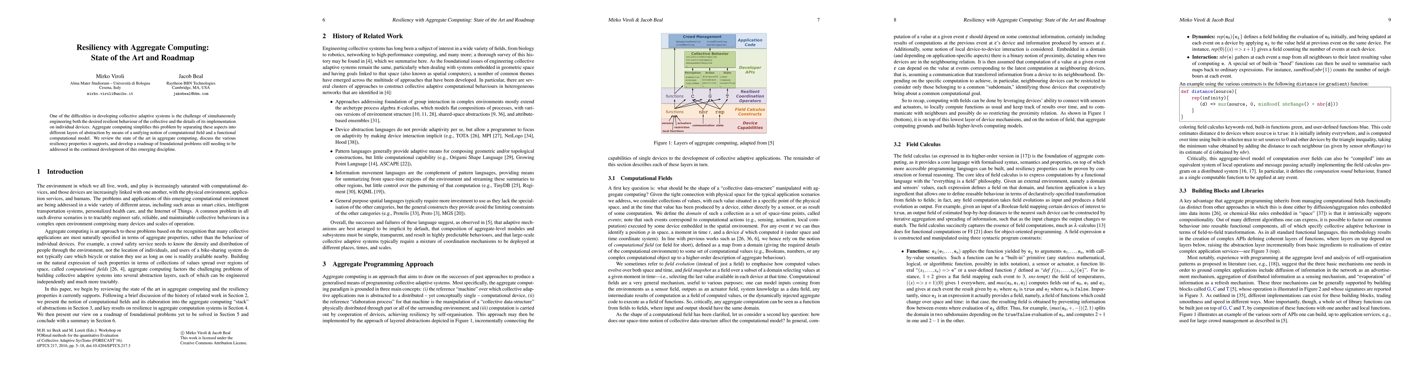 One of the difficulties in developing collective adaptive systems is the challenge of simultaneously engineering both the desired resilient behaviour of the collective and the details of its implementation on individual devices. Aggregate computing simplifies this problem by separating these aspects into different layers of abstraction by means of a unifying notion of computational field and a functional computational model. We review the state of the art in aggregate computing, discuss the various resiliency properties it supports, and develop a roadmap of foundational problems still needing to be addressed in the continued development of this emerging discipline.
