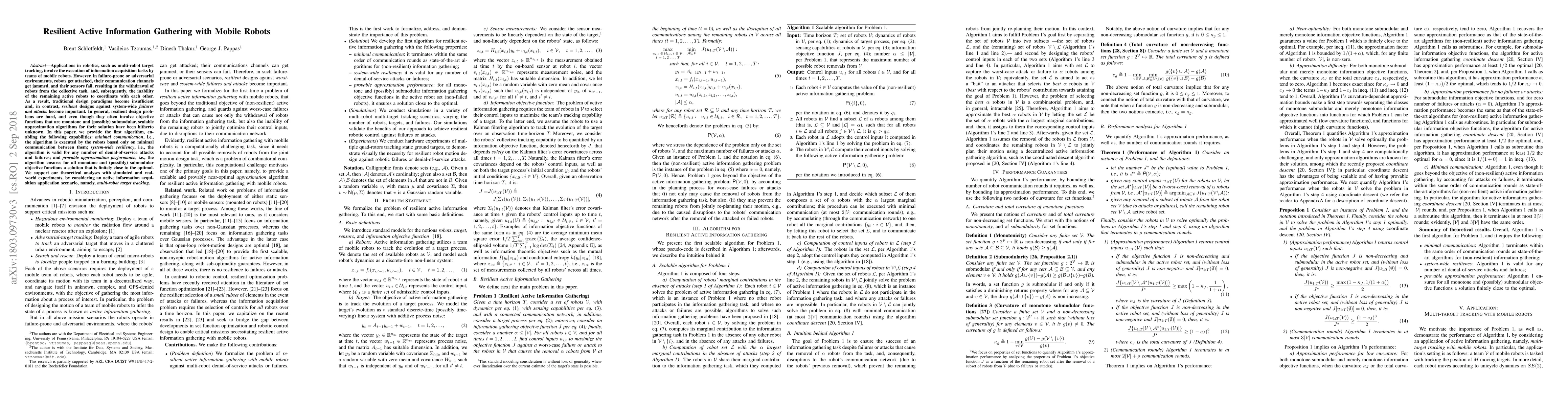 Applications of safety, security, and rescue in robotics, such as multi-robot target tracking, involve the execution of information acquisition tasks by teams of mobile robots. However, in failure-prone or adversarial environments, robots get attacked, their communication channels get jammed, and their sensors may fail, resulting in the withdrawal of robots from the collective task, and consequently the inability of the remaining active robots to coordinate with each other. As a result, traditional design paradigms become insufficient and, in contrast, resilient designs against system-wide failures and attacks become important. In general, resilient design problems are hard, and even though they often involve objective functions that are monotone or submodular, scalable approximation algorithms for their solution have been hitherto unknown. In this paper, we provide the first algorithm, enabling the following capabilities: minimal communication, i.e., the algorithm is executed by the robots based only on minimal communication between them; system-wide resiliency, i.e., the algorithm is valid for any number of denial-of-service attacks and failures; and provable approximation performance, i.e., the algorithm ensures for all monotone (and not necessarily submodular) objective functions a solution that is finitely close to the optimal. We quantify our algorithm's approximation performance using a notion of curvature for monotone set functions. We support our theoretical analyses with simulated and real-world experiments, by considering an active information gathering scenario, namely, multi-robot target tracking.
