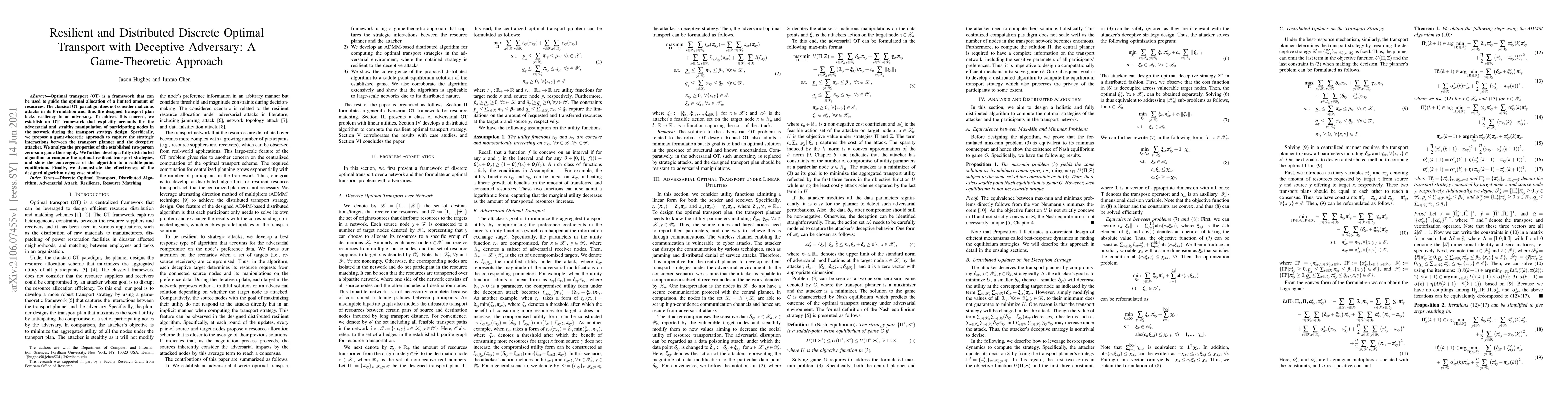 Optimal transport (OT) is a framework that can be used to guide the optimal allocation of a limited amount of resources. The classical OT paradigm does not consider malicious attacks in its formulation and thus the designed transport plan lacks resiliency to an adversary. To address this concern, we establish an OT framework that explicitly accounts for the adversarial and stealthy manipulation of participating nodes in the network during the transport strategy design. Specifically, we propose a game-theoretic approach to capture the strategic interactions between the transport planner and the deceptive attacker. We analyze the properties of the established two-person zero-sum game thoroughly. We further develop a fully distributed algorithm to compute the optimal resilient transport strategies, and show the convergence of the algorithm to a saddle-point equilibrium. Finally, we demonstrate the effectiveness of the designed algorithm using case studies.