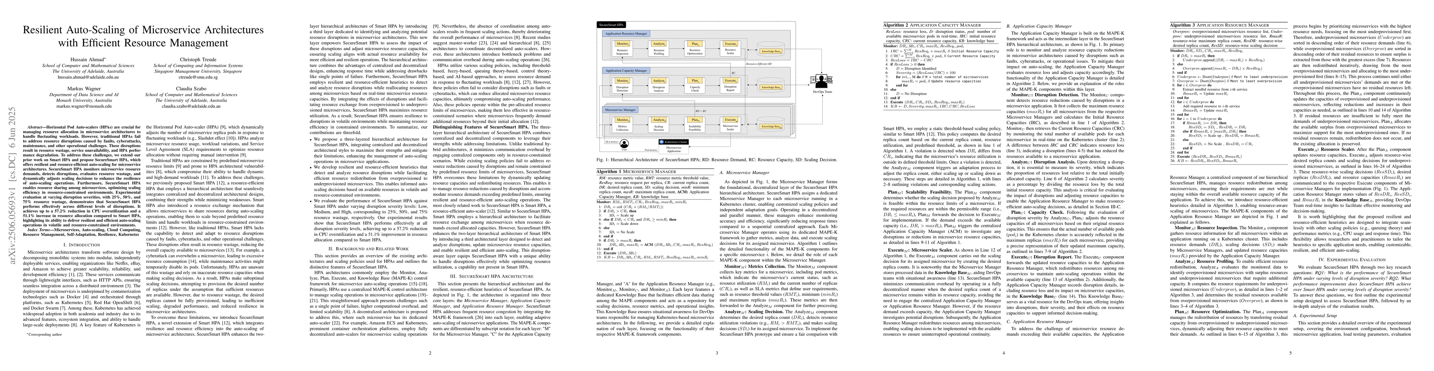Horizontal Pod Auto-scalers (HPAs) are crucial for managing resource allocation in microservice architectures to handle fluctuating workloads. However, traditional HPAs fail to address resource disruptions caused by faults, cyberattacks, maintenance, and other operational challenges. These disruptions result in resource wastage, service unavailability, and HPA performance degradation. To address these challenges, we extend our prior work on Smart HPA and propose SecureSmart HPA, which offers resilient and resource-efficient auto-scaling for microservice architectures. SecureSmart HPA monitors microservice resource demands, detects disruptions, evaluates resource wastage, and dynamically adjusts scaling decisions to enhance the resilience of auto-scaling operations. Furthermore, SecureSmart HPA enables resource sharing among microservices, optimizing scaling efficiency in resource-constrained environments. Experimental evaluation at varying disruption severities, with 25%, 50%, and 75% resource wastage, demonstrates that SecureSmart HPA performs effectively across different levels of disruptions. It achieves up to a 57.2% reduction in CPU overutilization and a 51.1% increase in resource allocation compared to Smart HPA, highlighting its ability to deliver resilient and efficient auto-scaling operations in volatile and resource-constrained environments.