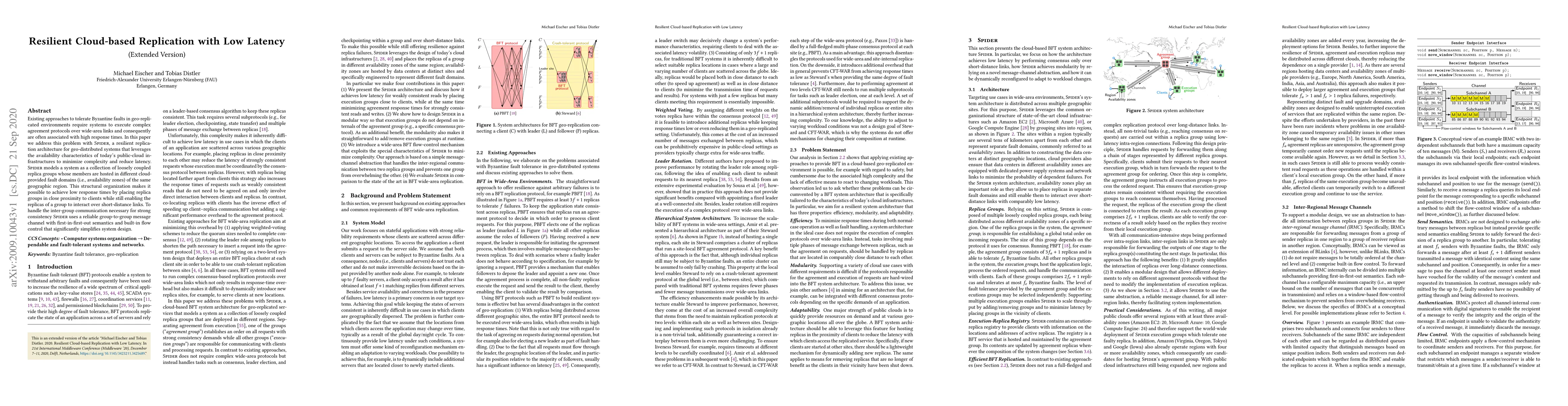 A new cloud-based replication system called Spider minimizes latency in geo-distributed systems while tolerating Byzantine faults. It achieves low response times by placing replica groups close to clients and simplifies communication between groups using a reliable message channel.