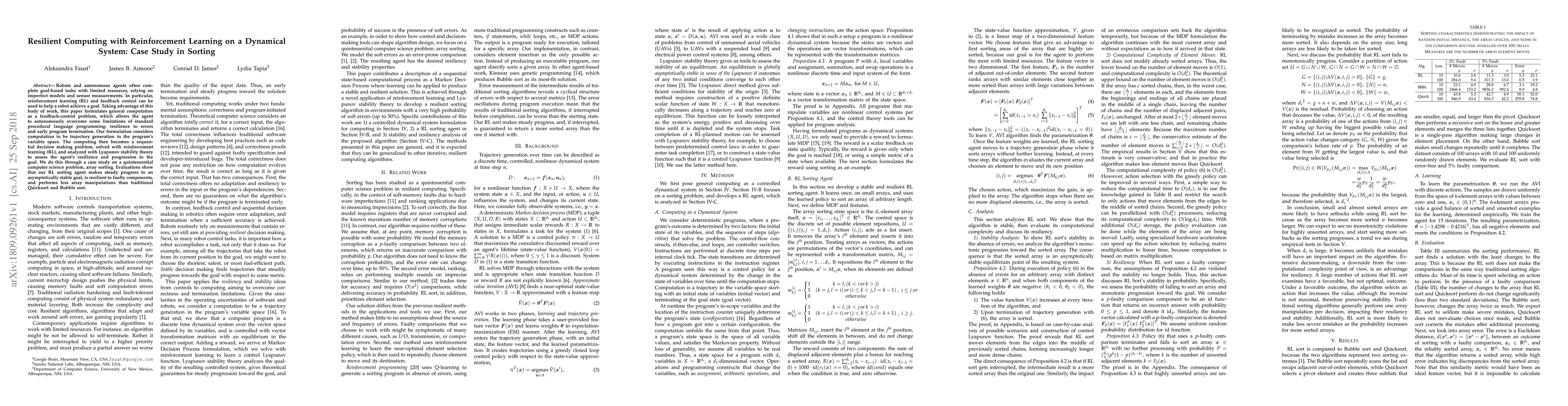 Robots and autonomous agents often complete goal-based tasks with limited resources, relying on imperfect models and sensor measurements. In particular, reinforcement learning (RL) and feedback control can be used to help a robot achieve a goal. Taking advantage of this body of work, this paper formulates general computation as a feedback-control problem, which allows the agent to autonomously overcome some limitations of standard procedural language programming: resilience to errors and early program termination. Our formulation considers computation to be trajectory generation in the program's variable space. The computing then becomes a sequential decision making problem, solved with reinforcement learning (RL), and analyzed with Lyapunov stability theory to assess the agent's resilience and progression to the goal. We do this through a case study on a quintessential computer science problem, array sorting. Evaluations show that our RL sorting agent makes steady progress to an asymptotically stable goal, is resilient to faulty components, and performs less array manipulations than traditional Quicksort and Bubble sort.
