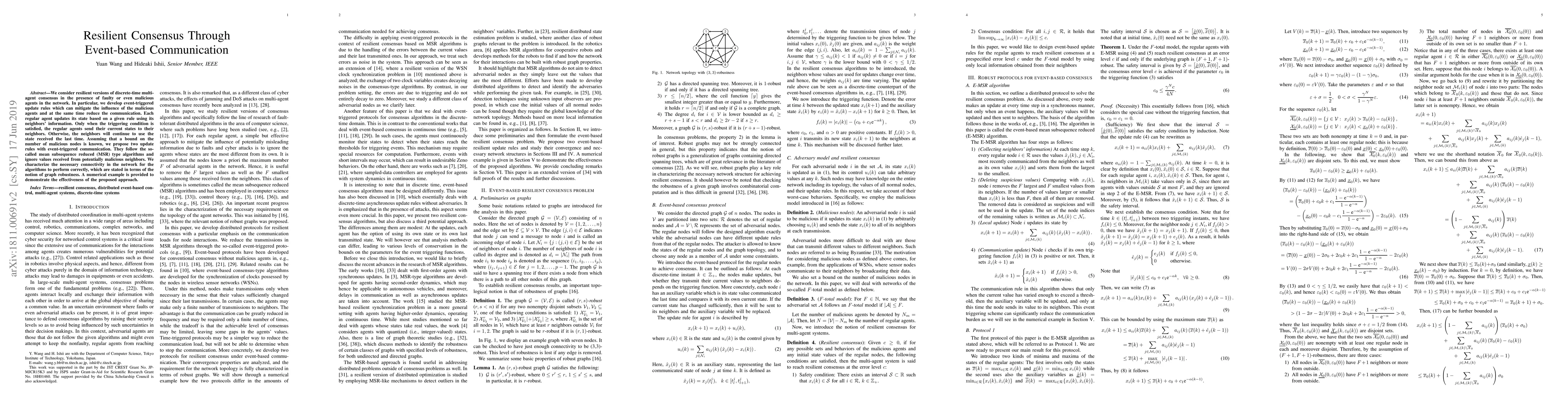 We consider resilient versions of discrete-time multi-agent consensus in the presence of faulty or even malicious agents in the network. In particular, we develop event-triggered update rules which can mitigate the influence of the malicious agents and at the same time reduce the necessary communication. Each regular agent updates its state based on a given rule using its neighbors' information. Only when the triggering condition is satisfied, the regular agents send their current states to their neighbors. Otherwise, the neighbors will continue to use the state received the last time. Assuming that a bound on the number of malicious nodes is known, we propose two update rules with event-triggered communication. They follow the so-called mean subsequence reduced (MSR) type algorithms and ignore values received from potentially malicious neighbors. We provide full characterizations for the necessary connectivity in the network for the algorithms to perform correctly, which are stated in terms of the notion of graph robustness. A numerical example is provided to demonstrate the effectiveness of the proposed approach.