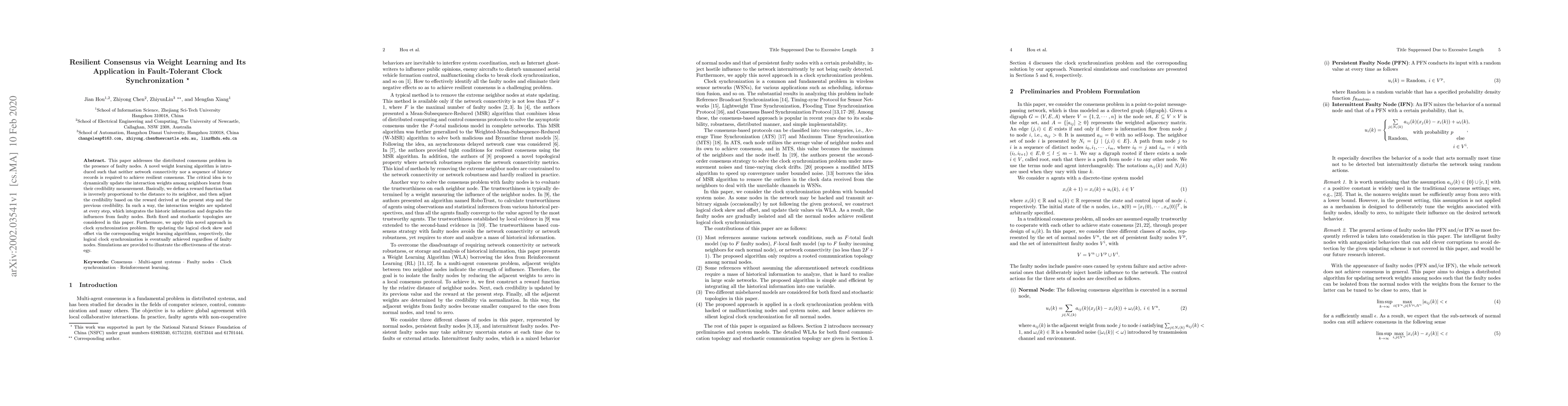 This paper proposes a weight learning algorithm to achieve resilient consensus in distributed systems with faulty nodes, dynamically updating interaction weights based on credibility measurements. The method is applied to fault-tolerant clock synchronization, effectively updating clock skew and offset to achieve synchronization despite faulty nodes.