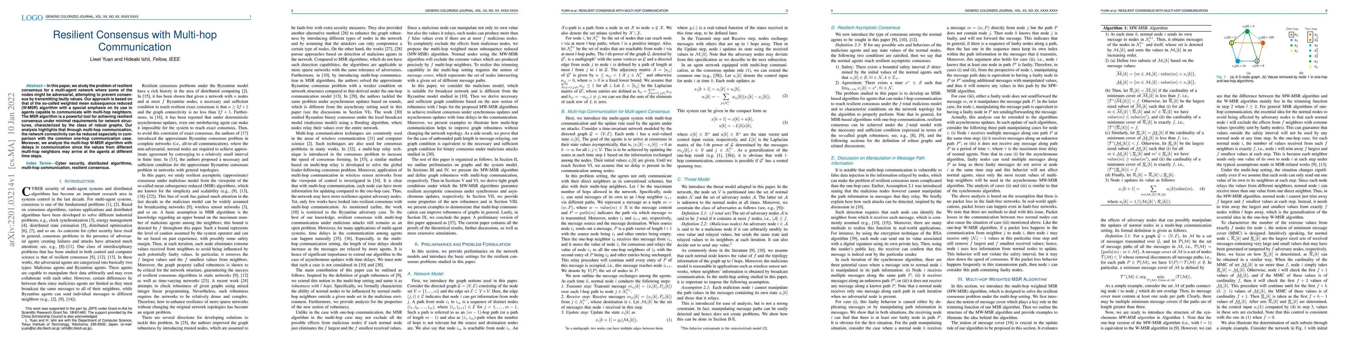 This paper investigates resilient consensus in multi-agent networks with adversarial nodes using the weighted mean subsequence reduced (W-MSR) algorithm, focusing on multi-hop communication. It demonstrates that multi-hop communication can reduce network connectivity and analyzes the algorithm's performance under communication delays.