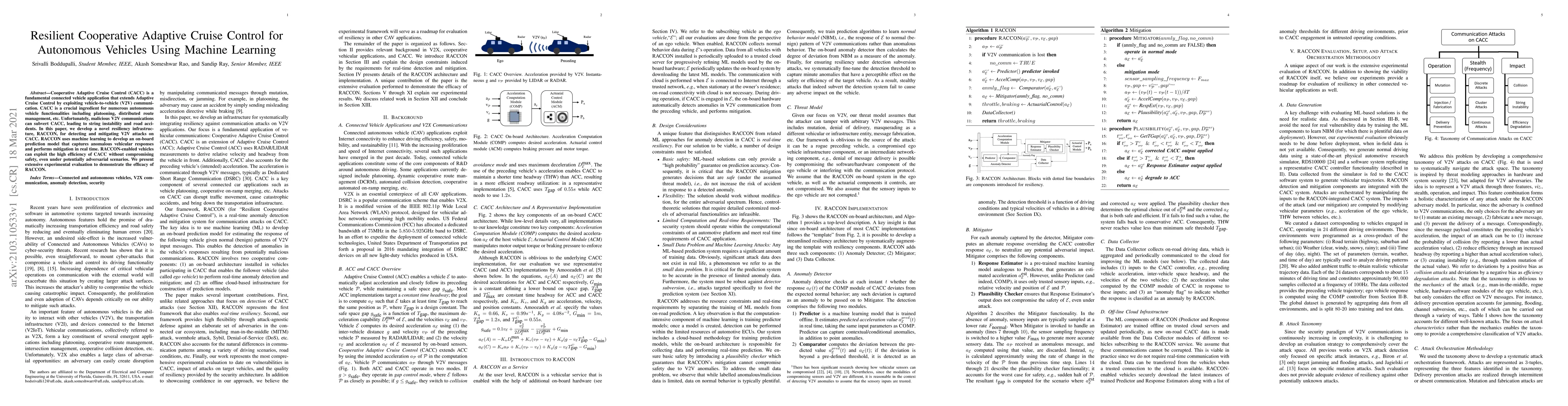 Cooperative Adaptive Cruise Control (CACC) is a fundamental connected vehicle application that extends Adaptive Cruise Control by exploiting vehicle-to-vehicle (V2V) communication. CACC is a crucial ingredient for numerous autonomous vehicle functionalities including platooning, distributed route management, etc. Unfortunately, malicious V2V communications can subvert CACC, leading to string instability and road accidents. In this paper, we develop a novel resiliency infrastructure, RACCON, for detecting and mitigating V2V attacks on CACC. RACCON uses machine learning to develop an on-board prediction model that captures anomalous vehicular responses and performs mitigation in real time. RACCON-enabled vehicles can exploit the high efficiency of CACC without compromising safety, even under potentially adversarial scenarios. We present extensive experimental evaluation to demonstrate the efficacy of RACCON.