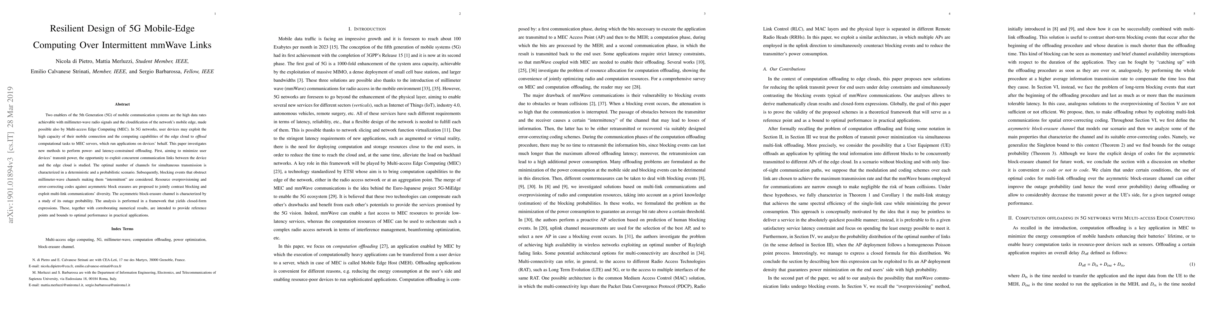 Two enablers of the 5th Generation (5G) of mobile communication systems are the high data rates achievable with millimeter-wave radio signals and the cloudification of the network's mobile edge, made possible also by Multi-access Edge Computing (MEC). In 5G networks, user devices may exploit the high capacity of their mobile connection and the computing capabilities of the edge cloud to offload computational tasks to MEC servers, which run applications on devices' behalf. This paper investigates new methods to perform power- and latency-constrained offloading. First, aiming to minimize user devices' transmit power, the opportunity to exploit concurrent communication links between the device and the edge cloud is studied. The optimal number of channels for simultaneous transmission is characterized in a deterministic and a probabilistic scenario. Subsequently, blocking events that obstruct millimeter-wave channels making them `intermittent' are considered. Resource overprovisioning and error-correcting codes against asymmetric block erasures are proposed to jointly contrast blocking and exploit multi-link communications' diversity. The asymmetric block-erasure channel is characterized by a study of its outage probability. The analysis is performed in a framework that yields closed-form expressions. These, together with corroborating numerical results, are intended to provide reference points and bounds to optimal performance in practical applications.