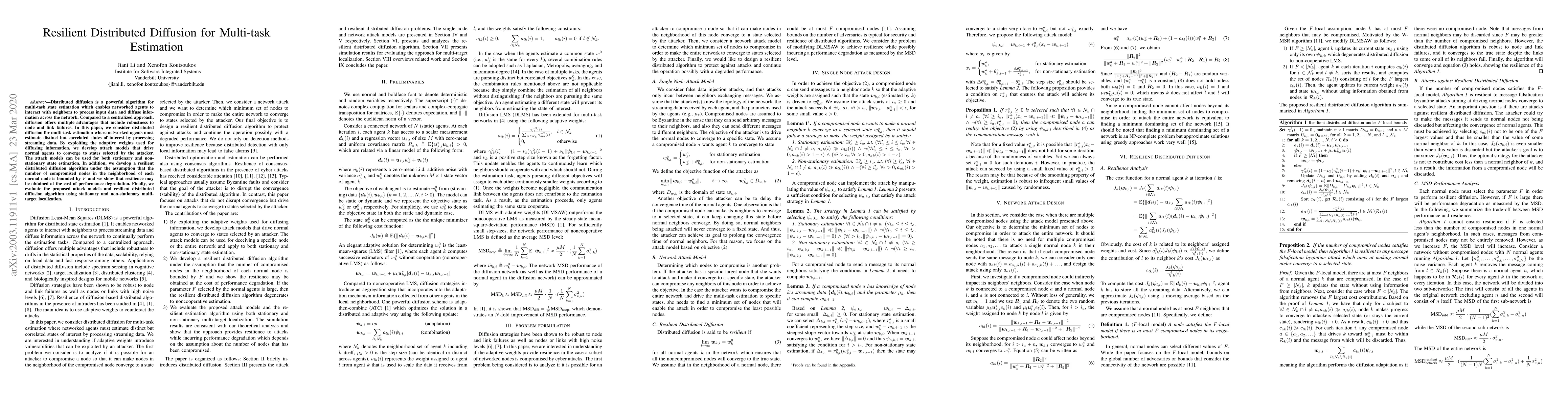 Distributed diffusion is a powerful algorithm for multi-task state estimation which enables networked agents to interact with neighbors to process input data and diffuse information across the network. Compared to a centralized approach, diffusion offers multiple advantages that include robustness to node and link failures. In this paper, we consider distributed diffusion for multi-task estimation where networked agents must estimate distinct but correlated states of interest by processing streaming data. By exploiting the adaptive weights used for diffusing information, we develop attack models that drive normal agents to converge to states selected by the attacker. The attack models can be used for both stationary and non-stationary state estimation. In addition, we develop a resilient distributed diffusion algorithm under the assumption that the number of compromised nodes in the neighborhood of each normal node is bounded by $F$ and we show that resilience may be obtained at the cost of performance degradation. Finally, we evaluate the proposed attack models and resilient distributed diffusion algorithm using stationary and non-stationary multi-target localization.