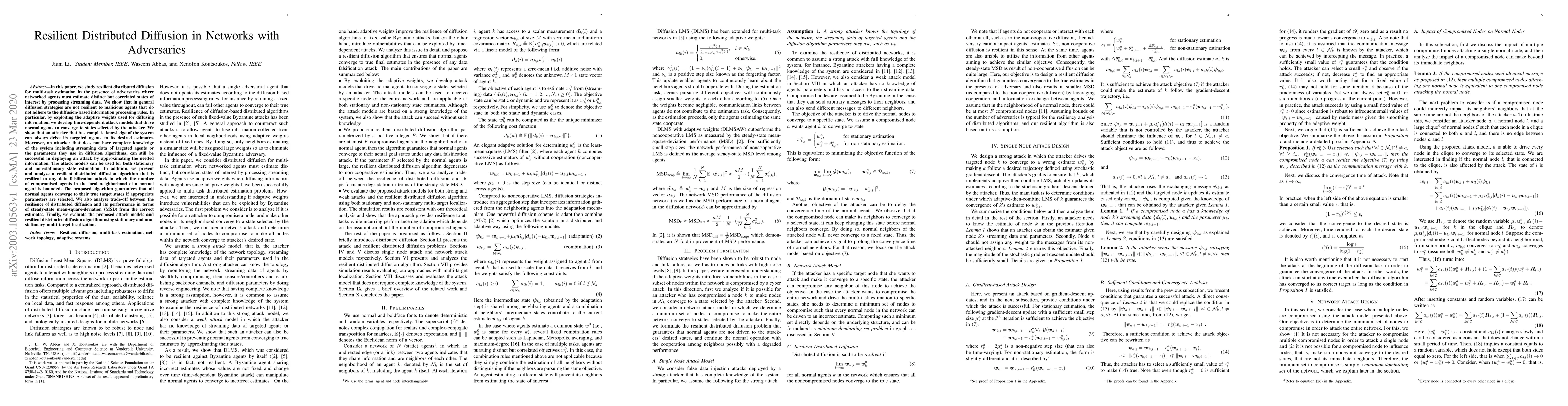 In this paper, we study resilient distributed diffusion for multi-task estimation in the presence of adversaries where networked agents must estimate distinct but correlated states of interest by processing streaming data. We show that in general diffusion strategies are not resilient to malicious agents that do not adhere to the diffusion-based information processing rules. In particular, by exploiting the adaptive weights used for diffusing information, we develop time-dependent attack models that drive normal agents to converge to states selected by the attacker. We show that an attacker that has complete knowledge of the system can always drive its targeted agents to its desired estimates. Moreover, an attacker that does not have complete knowledge of the system including streaming data of targeted agents or the parameters they use in diffusion algorithms, can still be successful in deploying an attack by approximating the needed information. The attack models can be used for both stationary and non-stationary state estimation.In addition, we present and analyze a resilient distributed diffusion algorithm that is resilient to any data falsification attack in which the number of compromised agents in the local neighborhood of a normal agent is bounded. The proposed algorithm guarantees that all normal agents converge to their true target states if appropriate parameters are selected. We also analyze trade-off between the resilience of distributed diffusion and its performance in terms of steady-state mean-square-deviation (MSD) from the correct estimates. Finally, we evaluate the proposed attack models and resilient distributed diffusion algorithm using stationary and non-stationary multi-target localization.