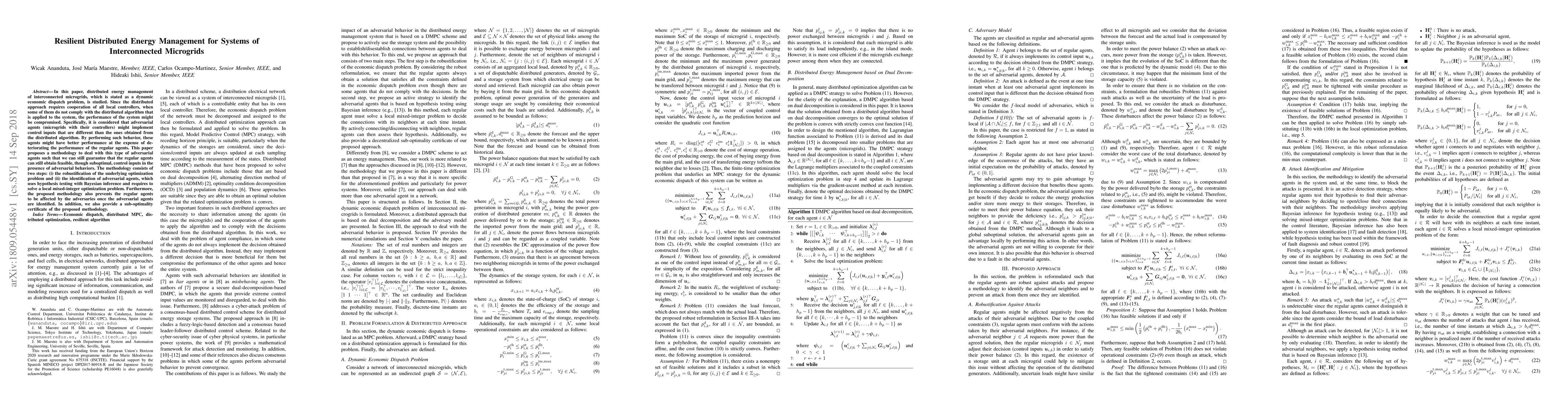 This paper proposes a methodology to manage distributed energy in interconnected microgrids, addressing the challenge of adversarial agents that may compromise system performance. The approach includes robust optimization and Bayesian inference for adversarial identification, ensuring regular agents can still achieve feasible, though suboptimal, control inputs.