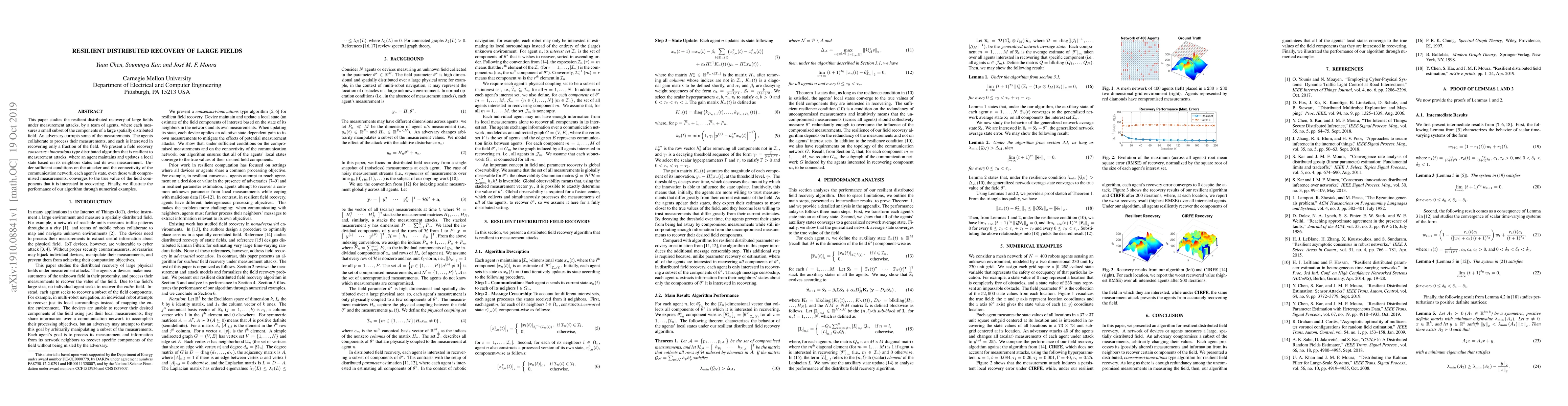 This paper proposes a resilient distributed recovery algorithm for large fields under measurement attacks, where agents collaborate to recover a fraction of the field despite corrupted measurements. The algorithm ensures convergence to true values even with compromised data, demonstrated through numerical examples.