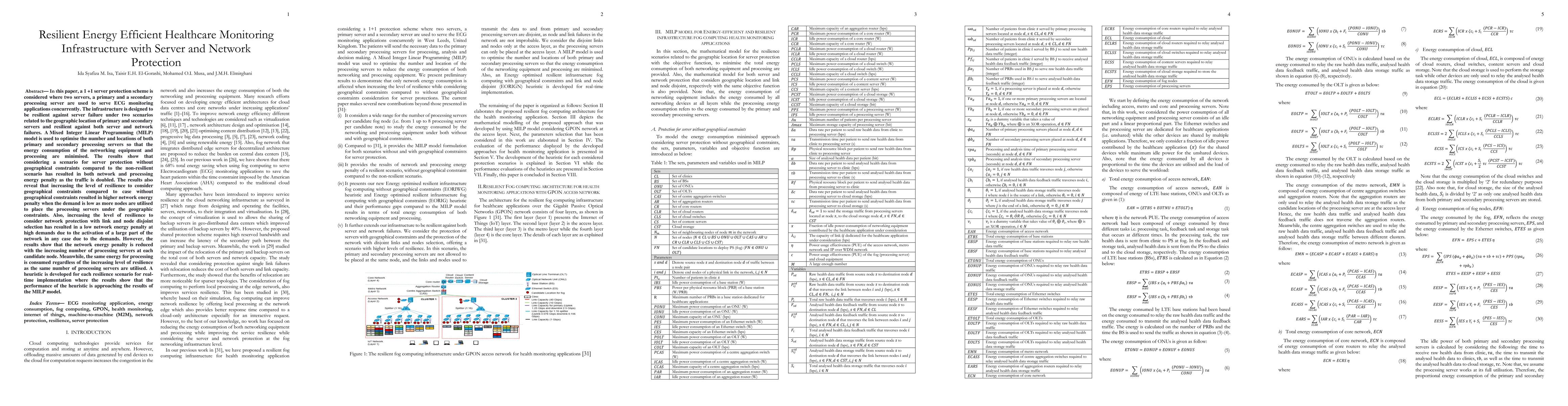 A new energy-efficient healthcare monitoring infrastructure is proposed with a 1+1 server protection scheme to minimize network and processing energy consumption. The study reveals that increasing resilience considerations can lead to varying network energy penalties depending on demand levels.