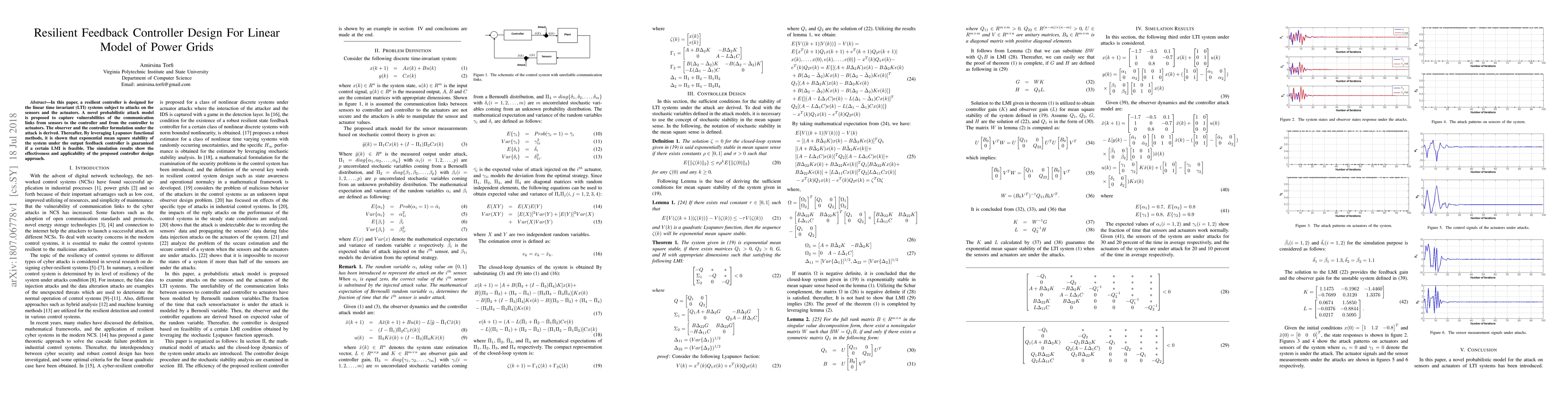 This paper designs a resilient feedback controller for linear power grids, addressing vulnerabilities from sensor and actuator attacks. It proposes a probabilistic attack model and uses Lyapunov methods to ensure exponential mean-square stability under certain conditions, validated by simulation results.
