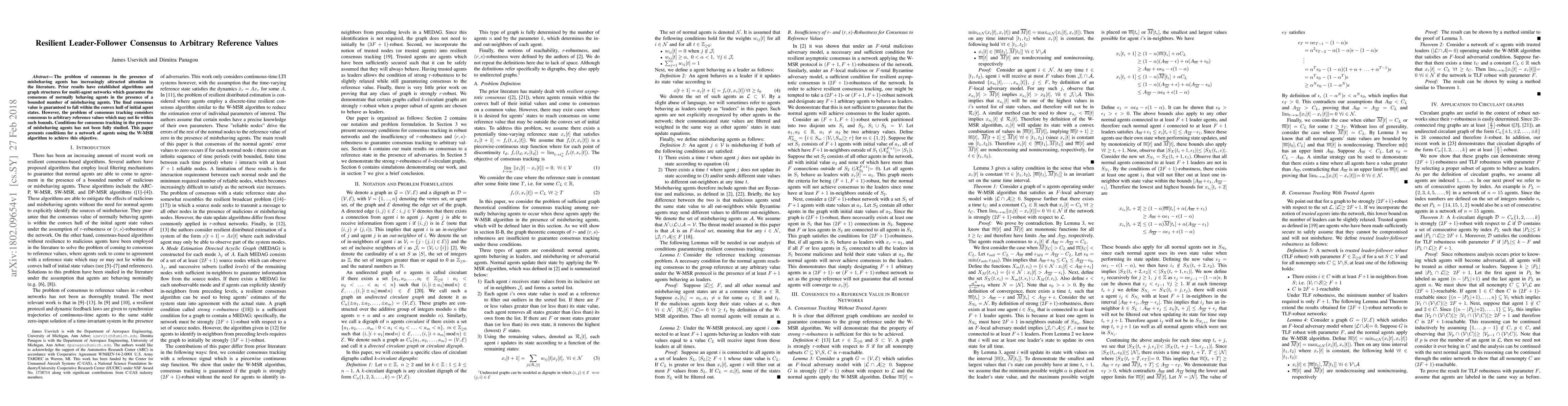 The problem of consensus in the presence of misbehaving agents has increasingly attracted attention in the literature. Prior results have established algorithms and graph structures for multi-agent networks which guarantee the consensus of normally behaving agents in the presence of a bounded number of misbehaving agents. The final consensus value is guaranteed to fall within the convex hull of initial agent states. However, the problem of consensus tracking considers consensus to arbitrary reference values which may not lie within such bounds. Conditions for consensus tracking in the presence of misbehaving agents has not been fully studied. This paper presents conditions for a network of agents using the W-MSR algorithm to achieve this objective.