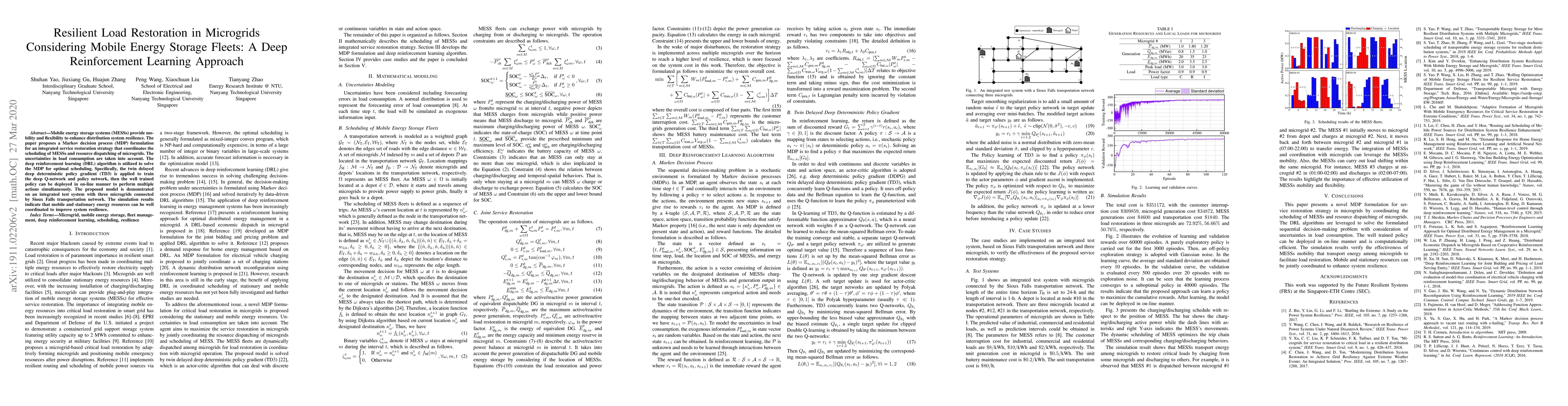 This paper proposes a deep reinforcement learning approach using twin delayed deep deterministic policy gradient (TD3) to optimize the scheduling of mobile energy storage systems (MESSs) for resilient load restoration in microgrids, considering uncertainties in load consumption. The model demonstrates improved system resilience through coordinated management of mobile and stationary energy resources.