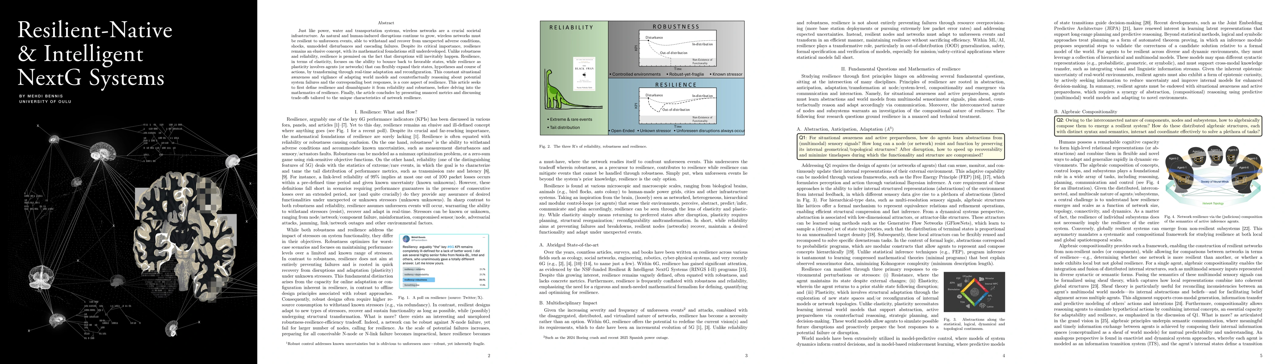 Just like power, water and transportation systems, wireless networks are a crucial societal infrastructure. As natural and human-induced disruptions continue to grow, wireless networks must be resilient to unforeseen events, able to withstand and recover from unexpected adverse conditions, shocks, unmodeled disturbances and cascading failures. Despite its critical importance, resilience remains an elusive concept, with its mathematical foundations still underdeveloped. Unlike robustness and reliability, resilience is premised on the fact that disruptions will inevitably happen. Resilience, in terms of elasticity, focuses on the ability to bounce back to favorable states, while resilience as plasticity involves agents (or networks) that can flexibly expand their states, hypotheses and course of actions, by transforming through real-time adaptation and reconfiguration. This constant situational awareness and vigilance of adapting world models and counterfactually reasoning about potential system failures and the corresponding best responses, is a core aspect of resilience. This article seeks to first define resilience and disambiguate it from reliability and robustness, before delving into the mathematics of resilience. Finally, the article concludes by presenting nuanced metrics and discussing trade-offs tailored to the unique characteristics of network resilience.