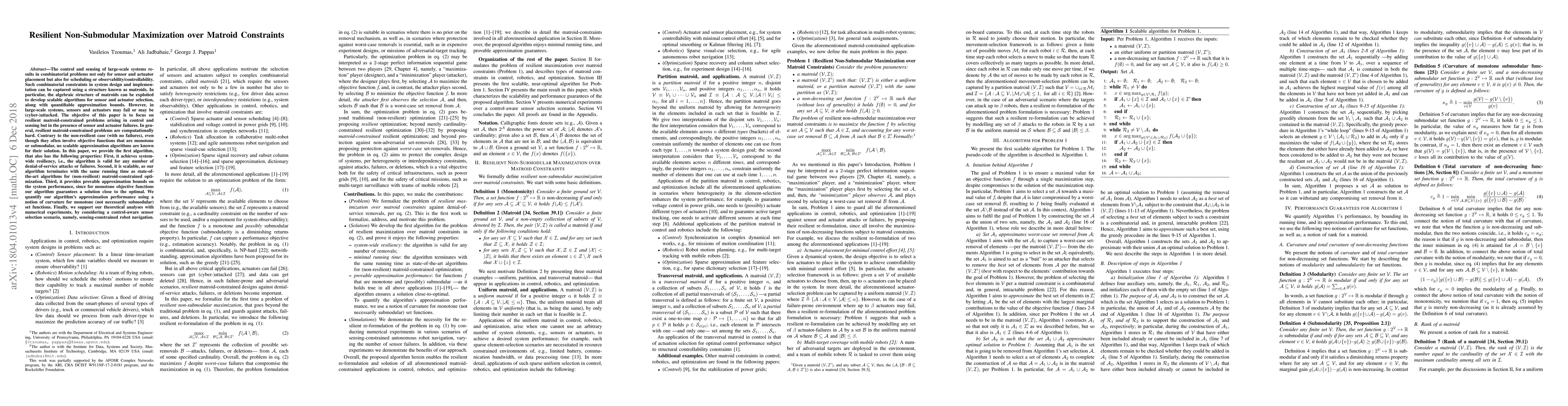 The control and sensing of large-scale systems results in combinatorial problems not only for sensor and actuator placement but also for scheduling or observability/controllability. Such combinatorial constraints in system design and implementation can be captured using a structure known as matroids. In particular, the algebraic structure of matroids can be exploited to develop scalable algorithms for sensor and actuator selection, along with quantifiable approximation bounds. However, in large-scale systems, sensors and actuators may fail or may be (cyber-)attacked. The objective of this paper is to focus on resilient matroid-constrained problems arising in control and sensing but in the presence of sensor and actuator failures. In general, resilient matroid-constrained problems are computationally hard. Contrary to the non-resilient case (with no failures), even though they often involve objective functions that are monotone or submodular, no scalable approximation algorithms are known for their solution. In this paper, we provide the first algorithm, that also has the following properties: First, it achieves system-wide resiliency, i.e., the algorithm is valid for any number of denial-of-service attacks or failures. Second, it is scalable, as our algorithm terminates with the same running time as state-of-the-art algorithms for (non-resilient) matroid-constrained optimization. Third, it provides provable approximation bounds on the system performance, since for monotone objective functions our algorithm guarantees a solution close to the optimal. We quantify our algorithm's approximation performance using a notion of curvature for monotone (not necessarily submodular) set functions. Finally, we support our theoretical analyses with numerical experiments, by considering a control-aware sensor selection scenario, namely, sensing-constrained robot navigation.
