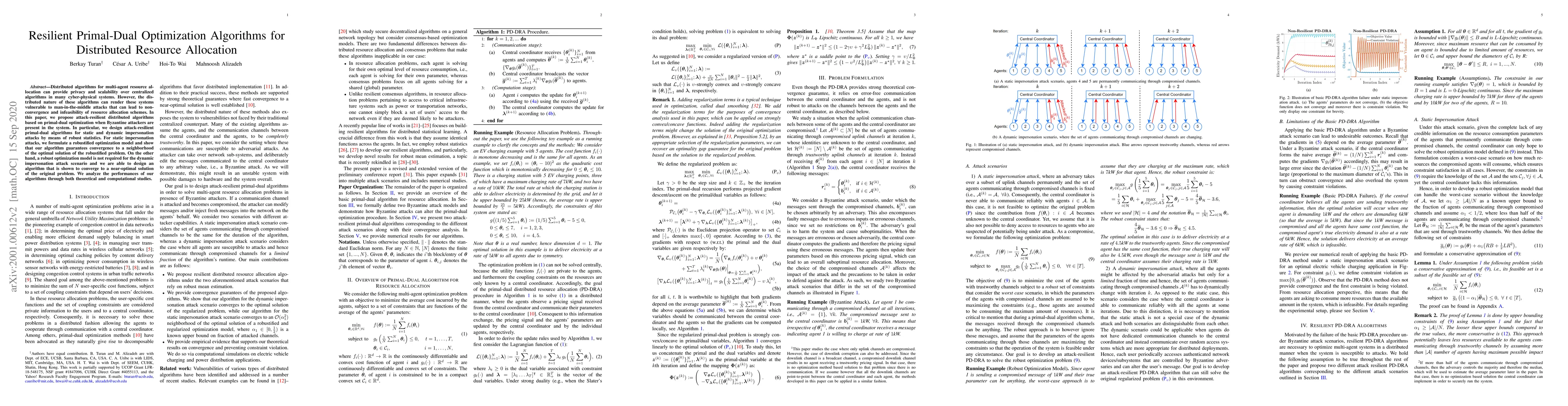 Distributed algorithms for multi-agent resource allocation can provide privacy and scalability over centralized algorithms in many cyber-physical systems. However, the distributed nature of these algorithms can render these systems vulnerable to man-in-the-middle attacks that can lead to non-convergence and infeasibility of resource allocation schemes. In this paper, we propose attack-resilient distributed algorithms based on primal-dual optimization when Byzantine attackers are present in the system. In particular, we design attack-resilient primal-dual algorithms for static and dynamic impersonation attacks by means of robust statistics. For static impersonation attacks, we formulate a robustified optimization model and show that our algorithm guarantees convergence to a neighborhood of the optimal solution of the robustified problem. On the other hand, a robust optimization model is not required for the dynamic impersonation attack scenario and we are able to design an algorithm that is shown to converge to a near-optimal solution of the original problem. We analyze the performances of our algorithms through both theoretical and computational studies.