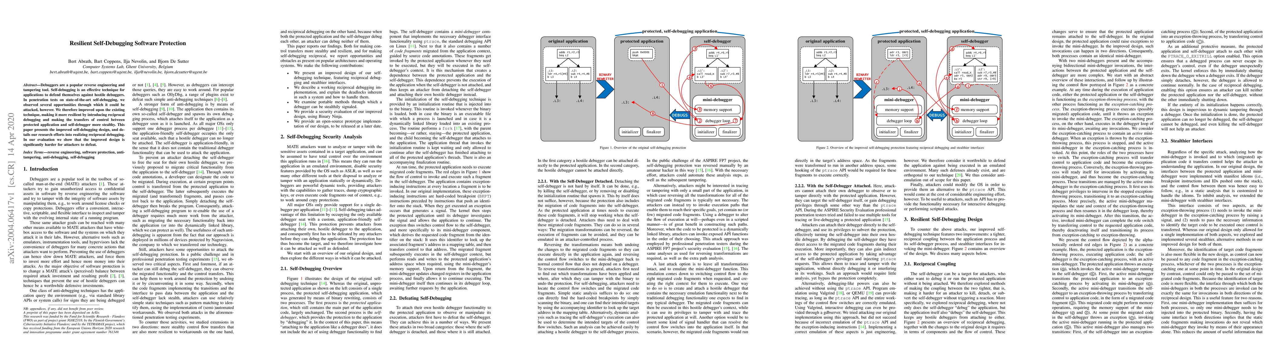 This paper introduces an enhanced self-debugging technique for software protection against reverse engineering and tampering, featuring reciprocal debugging to make control transfers more stealthy. The improved design is shown to be significantly harder for attackers to defeat.