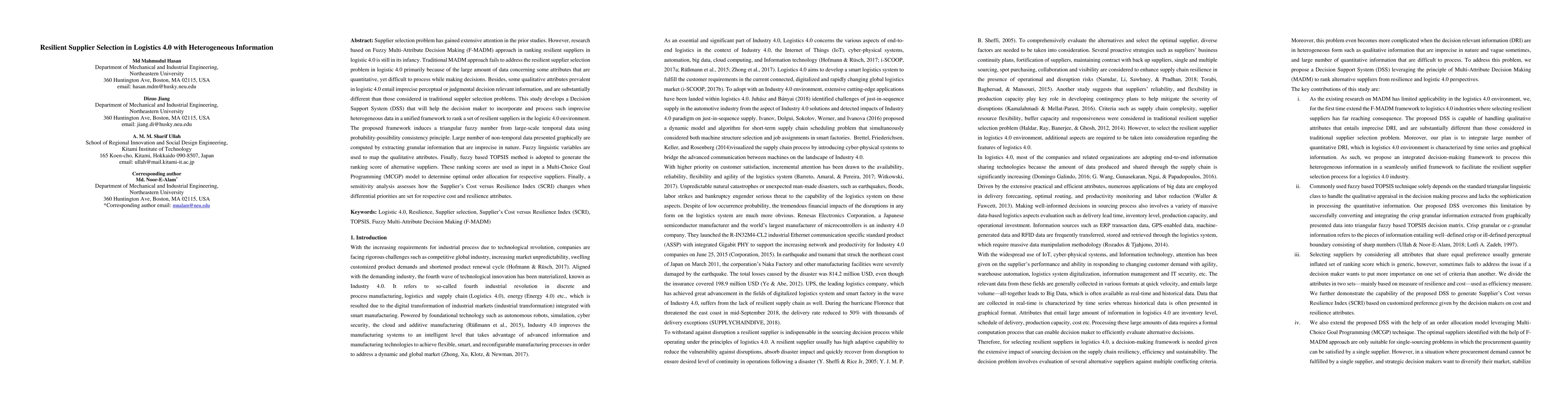 This study develops a Decision Support System to rank resilient suppliers in logistics 4 with heterogeneous data using fuzzy logic and TOPSIS method, aiming to optimize order allocation and supplier selection.