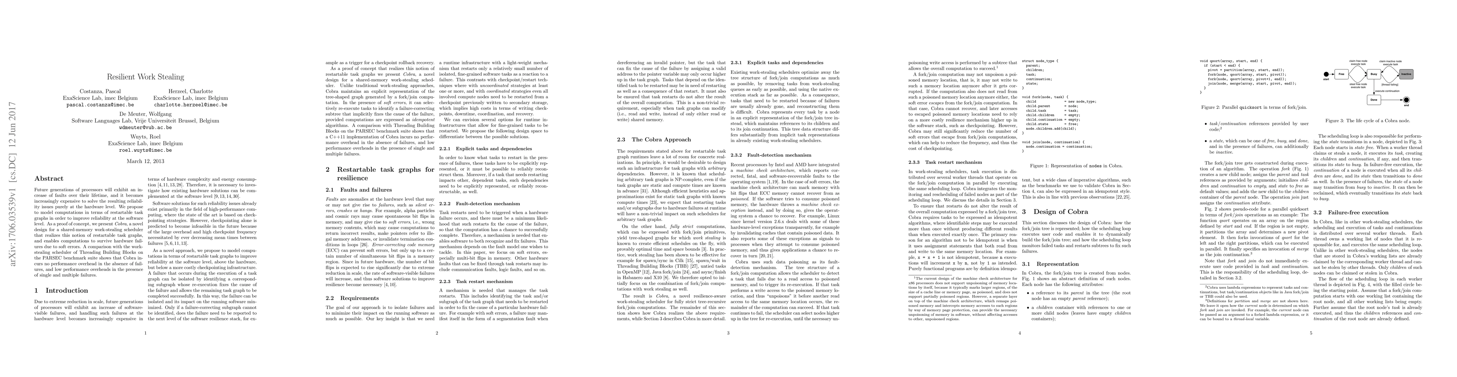 Future generations of processors will exhibit an increase of faults over their lifetime, and it becomes increasingly expensive to solve the resulting reliability issues purely at the hardware level. We propose to model computations in terms of restartable task graphs in order to improve reliability at the software level. As a proof of concept, we present Cobra, a novel design for a shared-memory work-stealing scheduler that realizes this notion of restartable task graphs, and enables computations to survive hardware failures due to soft errors. A comparison with the work-stealing scheduler of Threading Building Blocks on the PARSEC benchmark suite shows that Cobra incurs no performance overhead in the absence of failures, and low performance overheads in the presence of single and multiple failures.