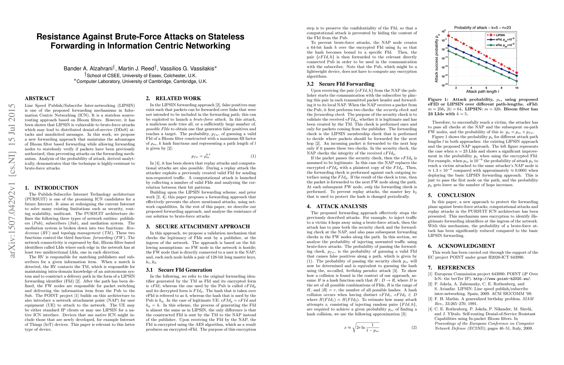 The research proposes a new forwarding approach for Information Centric Networking (ICN) that maintains the advantages of Bloom filter-based forwarding while allowing stateless verification of packet authorization, preventing brute-force attacks on the forwarding mechanism.