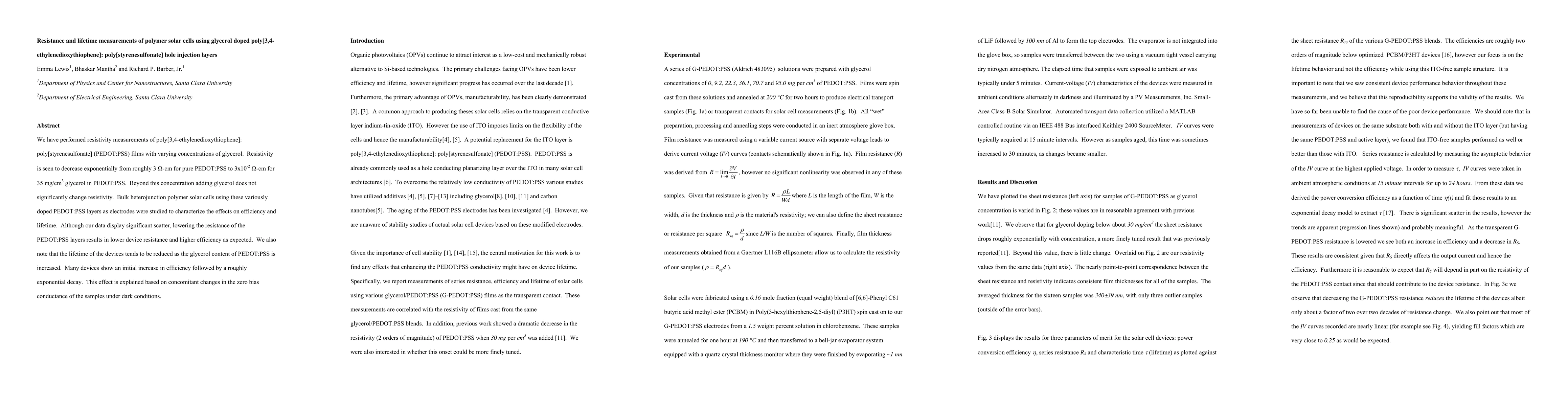 This study investigates the resistivity of PEDOT:PSS films with varying glycerol concentrations, finding that lower resistivity correlates with higher solar cell efficiency but also tends to reduce device lifetime. The optimal glycerol concentration balances efficiency and longevity in polymer solar cells.