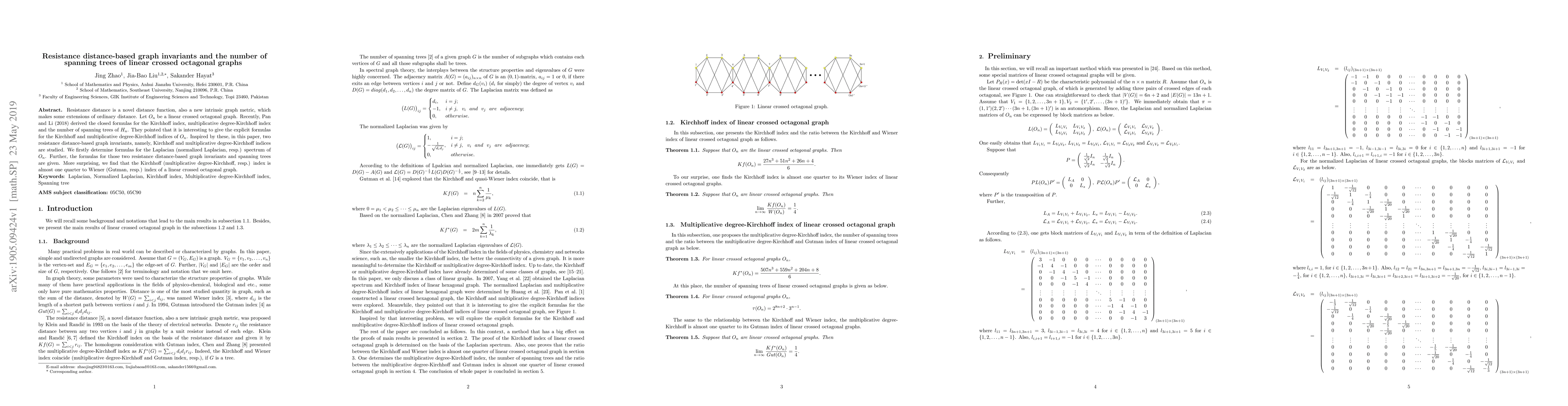 This paper investigates resistance distance-based graph invariants, specifically the Kirchhoff and multiplicative degree-Kirchhoff indices, for linear crossed octagonal graphs. It derives formulas for these indices and the number of spanning trees, revealing a surprising relationship between these indices and Wiener/Gutman indices.