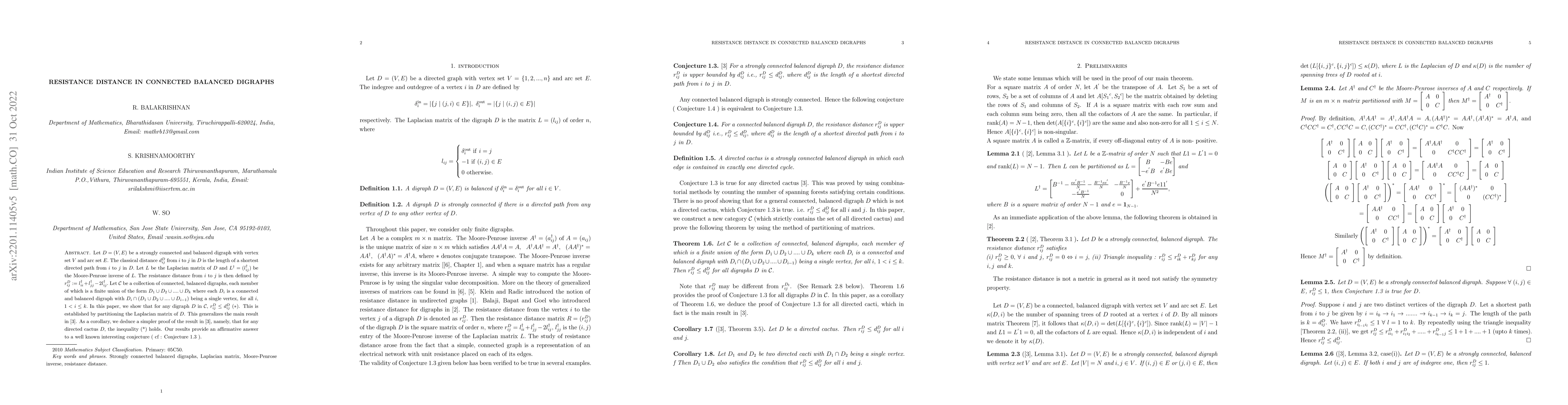 Let $D = (V, E)$ be a strongly connected and balanced digraph with vertex set $V$ and arc set $E.$ The classical distance $d_{ij}^D$ from $i$ to $j$ in $D$ is the length of a shortest directed path from $i$ to $j$ in $D.$ Let $L$ be the Laplacian matrix of $D$ and $ L^{\dagger} = ( l_{ij}^{\dagger} )$ be the Moore-Penrose inverse of $L.$ The resistance distance from $i$ to $j$ is then defined by $r_{ij}^D := l_{ii}^{\dagger } + l_{jj}^{\dagger } - 2 l_{ij}^{\dagger }.$ Let $\{ D_1, D_2, ...., D_k \}$ be a sequence of strongly connected balanced digraphs with $D_i \cap D_j$ having at most one vertex in common for all $i \neq j$ and with $r_{ij}^{D_t} \leq d_{ij}^{D_t} \ \forall \ t = 1 \ \mathrm{to} \ k.$ Let $\mathcal{C}$ be a collection of connected, balanced digraphs, each member of which is a finite union of the form $D_1 \cup D_2 \cup ....\cup D_k$ where each $D_i$ is a connected and balanced digraph with $D_{i} \cap ( D_1 \cup D_2 \cup ....\cup D_{i-1} )$ being a single vertex, for all $i,$ $1 < i \leq k.$ In this paper, we show that for any digraph $D$ in $\mathcal{C}$, $r_{ij}^D \leq d_{ij}^D \ (*)$. This is established by partitioning the Laplacian matrix of $D$. This generalizes the main result in [3]. As a corollary, we deduce a simpler proof of the result in [3], namely, that for any directed cactus $D$, the inequality (*) holds. Our results provide an affirmative answer to a well known interesting conjecture ( cf : Conjecture 1.3 ).